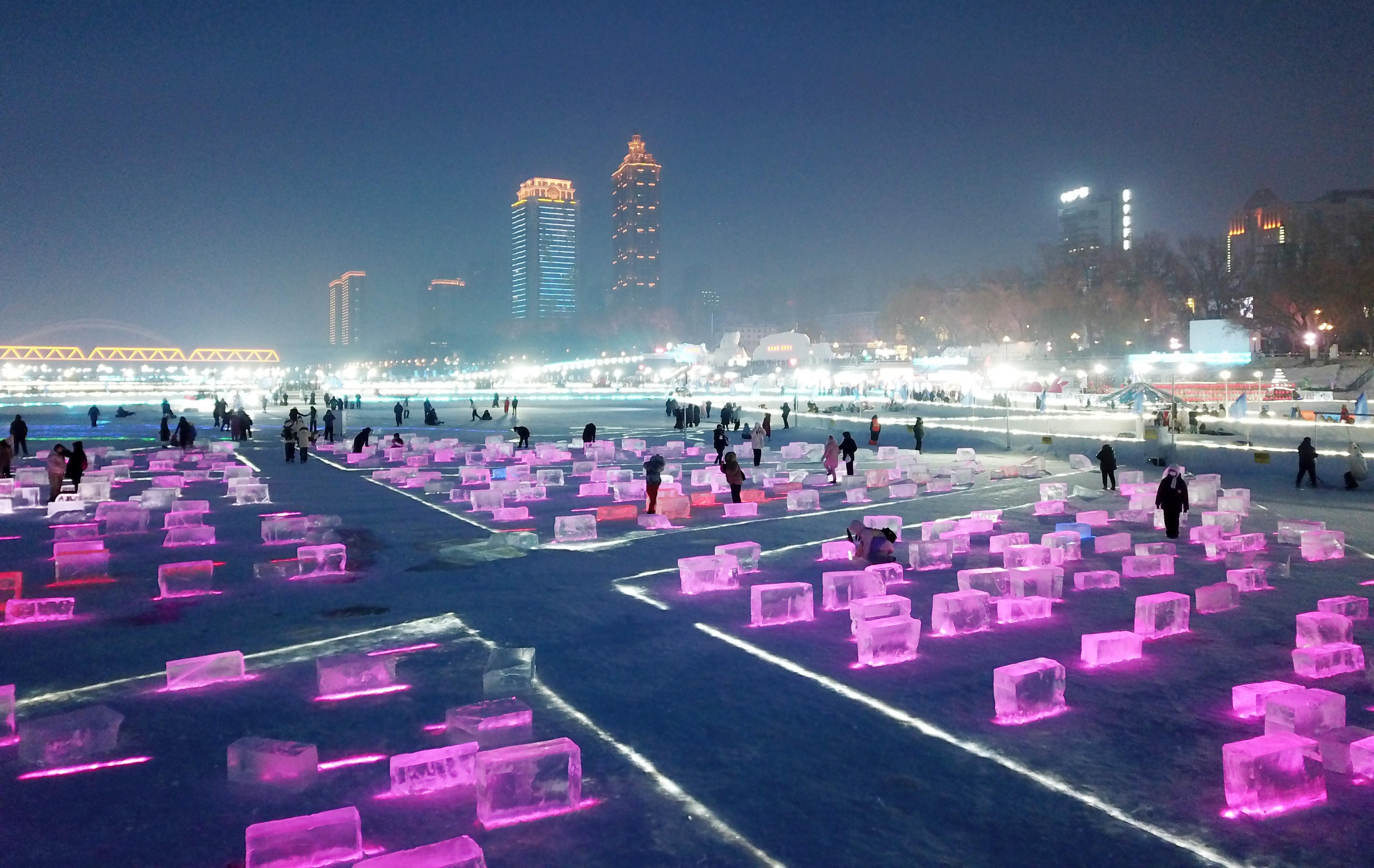 近日,在哈尔滨松花江冰雪嘉年华景区江面上,一处由冰块和灯光组合成的开放式“冰光秀场”亮相,吸引游客前来游玩、拍照。