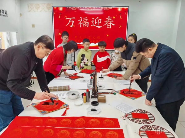 “龙腾四海呈祥瑞 凤舞九天纳福音”“九龙献瑞庆良辰 万物呈祥荣盛世”……一副副满载祝福、寓意吉祥的春联作品“新鲜出炉”,辖区正值寒假的青少年书法爱好者也纷纷参与到活动中来,在书法艺术家们的悉心辅导下,创作了多副春联、福字,吸引了辖区居民围观点评,为精湛的书艺点赞。书法家们还会同街道办事处工作人员来到辖区居民家中,赠送春联、福字,送去节日的问候和祝福。