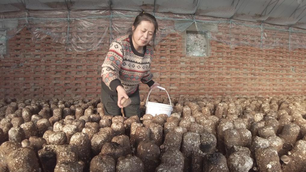 在黑龙江省齐齐哈尔市甘南县兴十四村现代农业示范园区,村民石占红正在采摘香菇。新华社记者唐铁富 摄