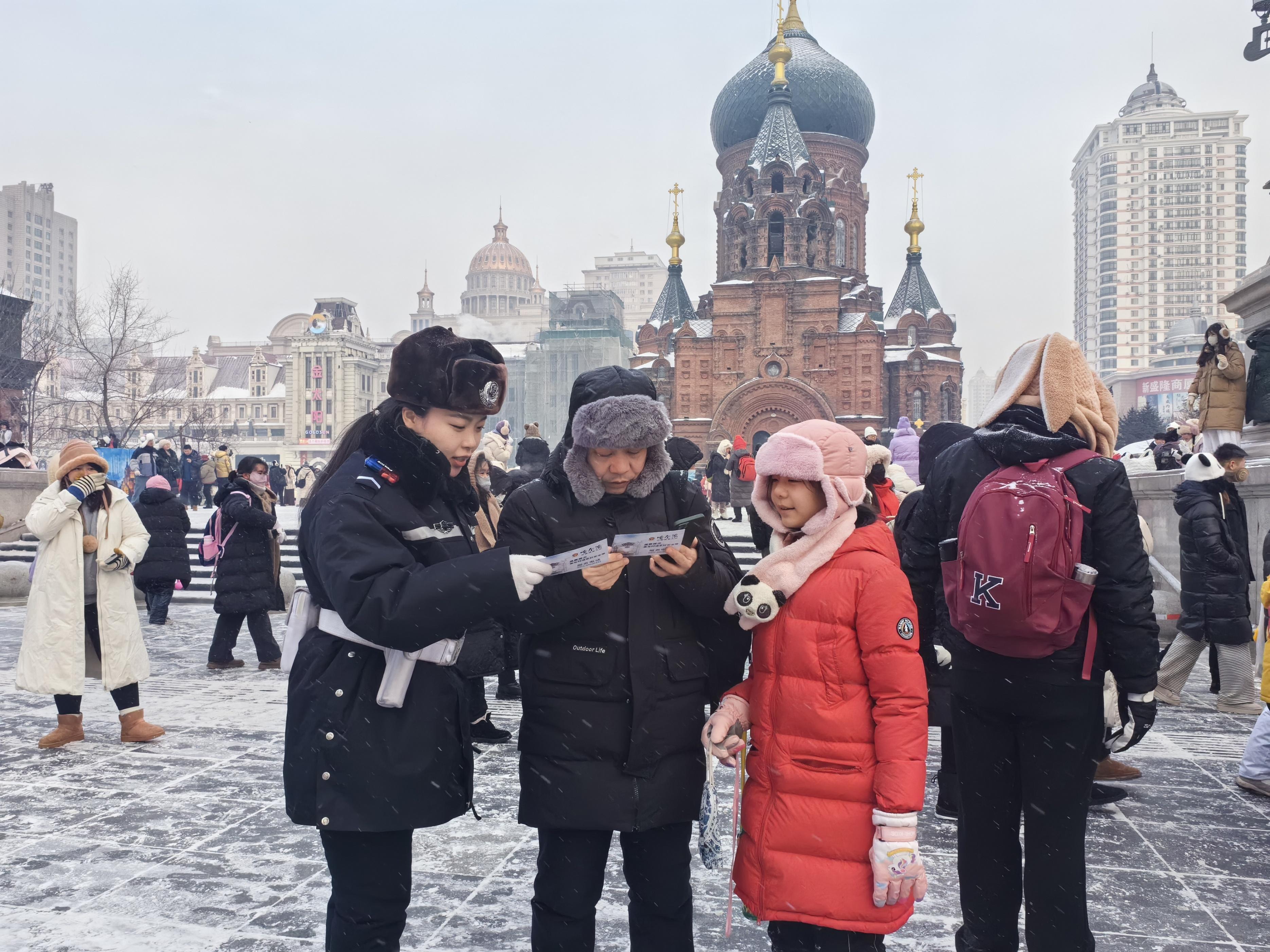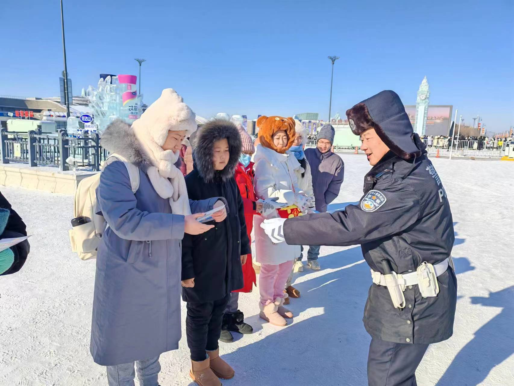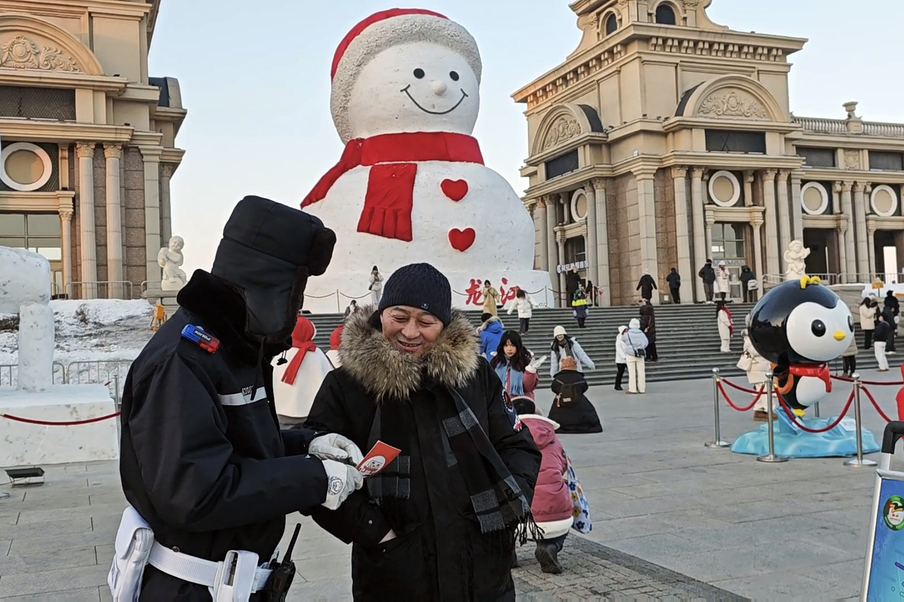 在音乐广场的大雪人景点,交警部门设立宣传站,摆放宣传展板,发放文明交通提示卡,重点向来自南方的“金豆们”宣传安全带在发生事故时的重要作用。