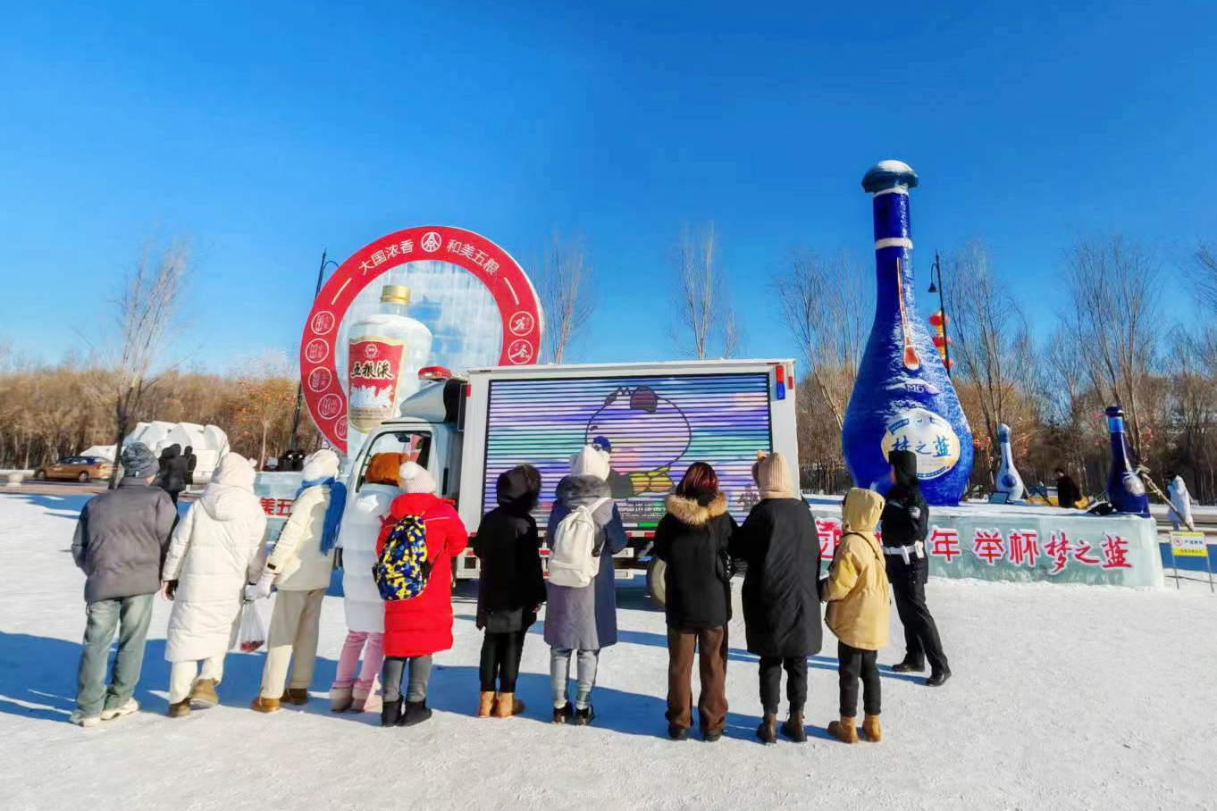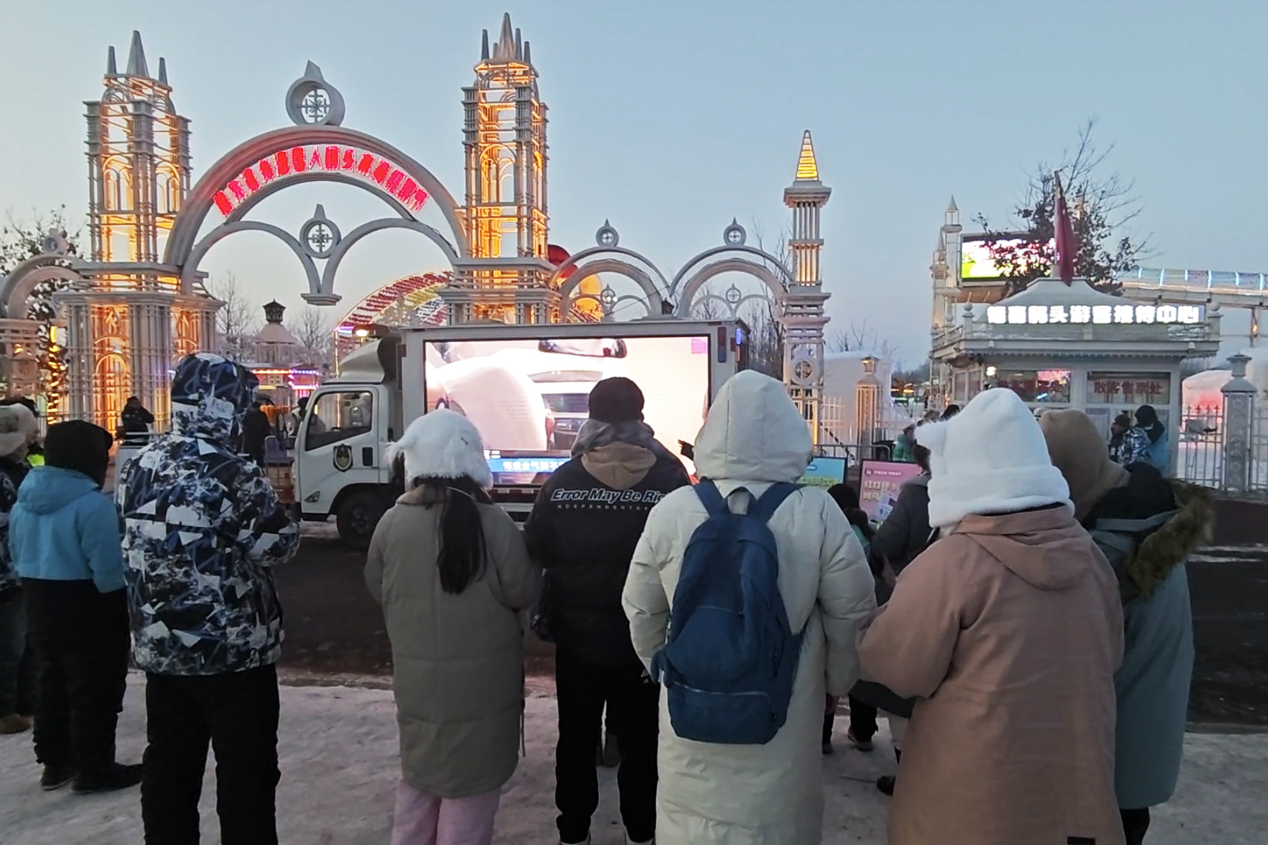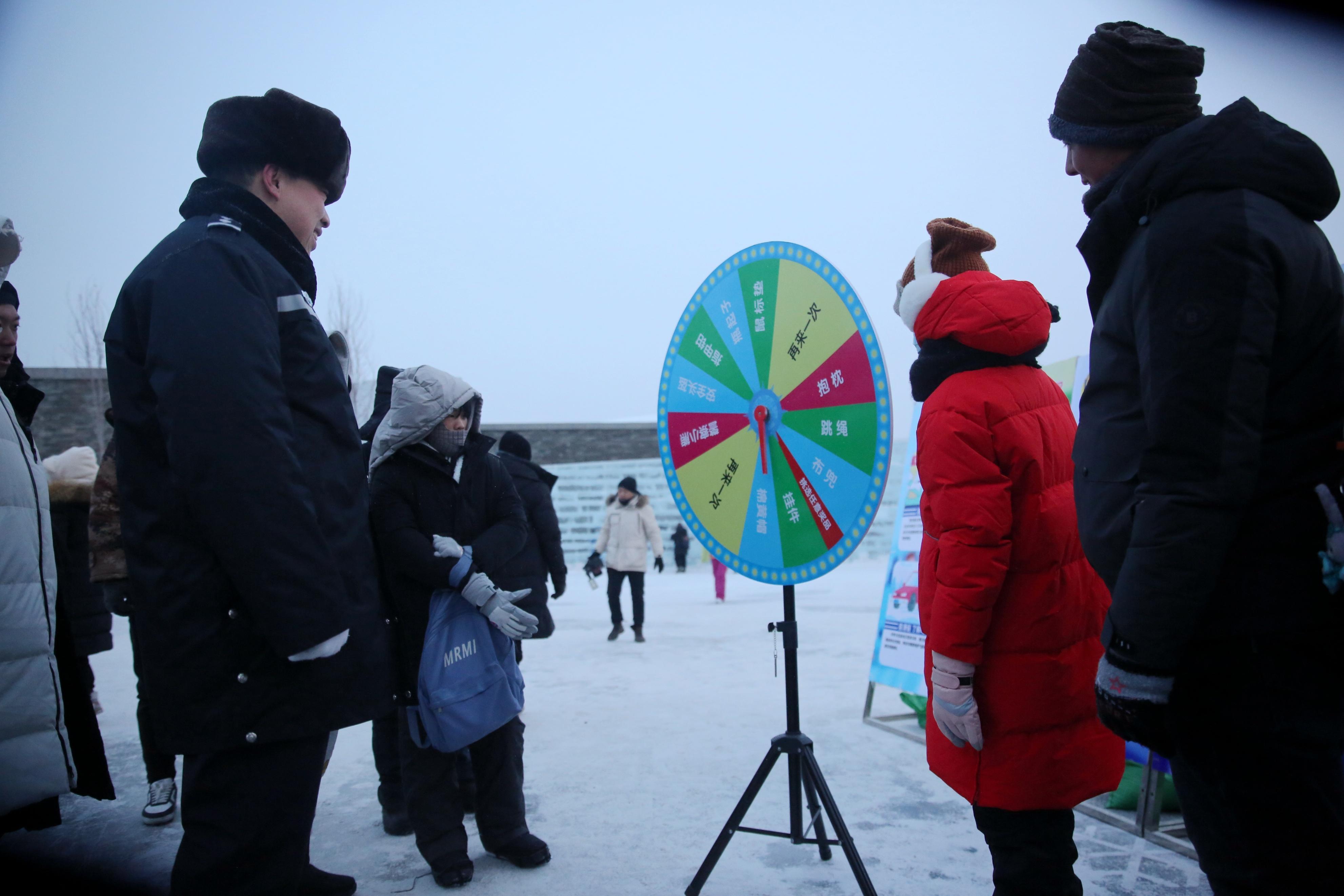在音乐广场的大雪人景点,交警部门设立宣传站,摆放宣传展板,发放文明交通提示卡,重点向来自南方的“金豆们”宣传安全带在发生事故时的重要作用。