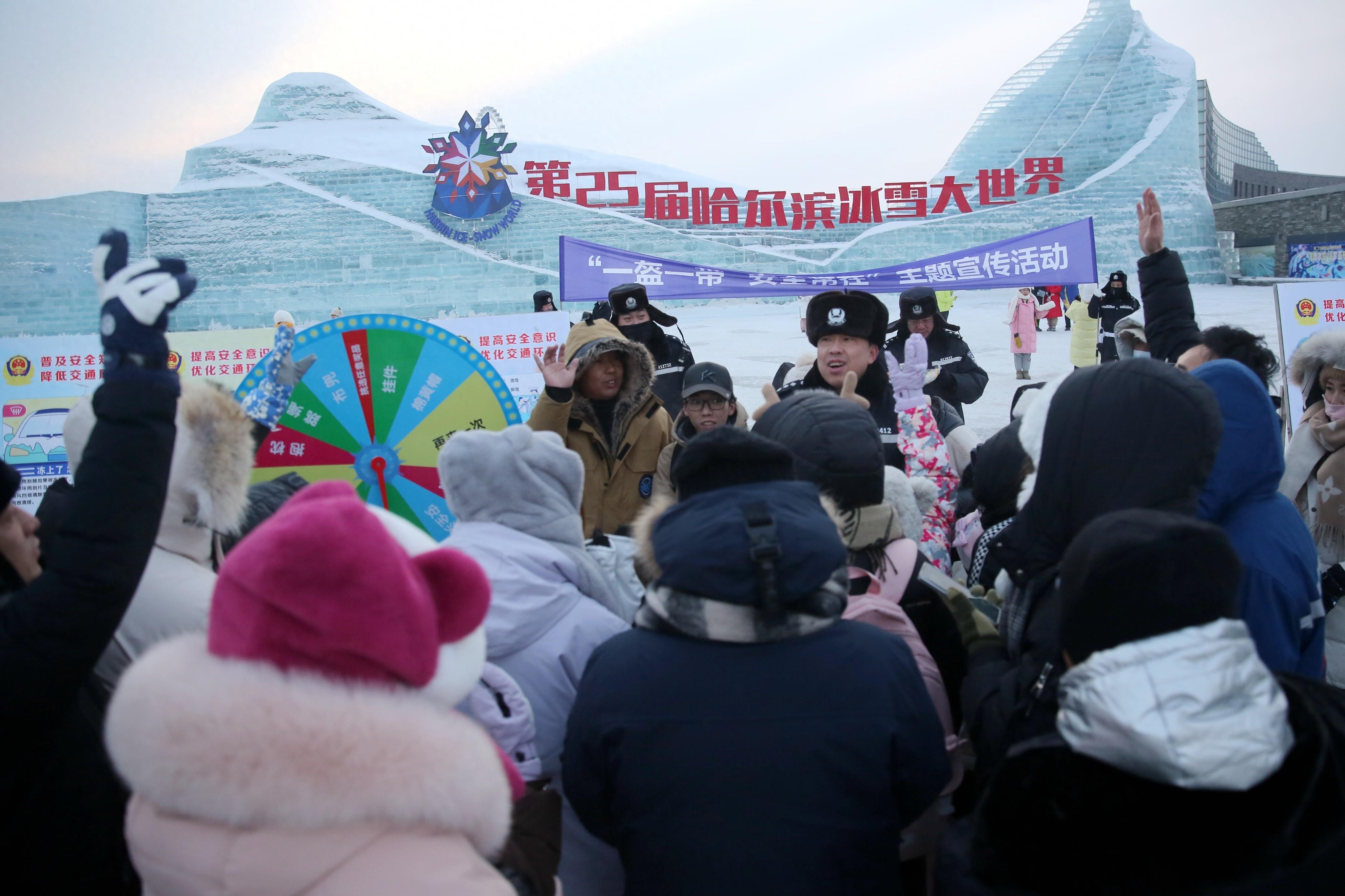 在第25届哈尔滨冰雪大世界活动广场,交警部门设立交通安全宣传台,组织开展“一盔一带,安全常在”主题宣传活动。活动现场气氛热烈,往来游客如织,交警现场开展交通安全宣讲,针对游客们普遍乘坐客运车辆出行的情况,重点提示广大游客乘坐客车时,一定全程全员都要系好安全带,在过街时要走斑马线,看信号通行,做到文明交通安全出行。