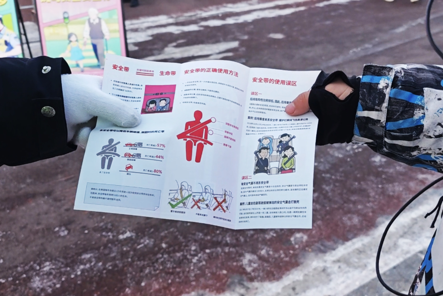 在中央大街和索菲亚广场重点旅游景区,交警部门摆放宣传车,播放《一盔一带 安全常在》交通安全宣传片,向游客们发放“安全带=生命带”提示卡,提示规范使用安全带的注意事项。