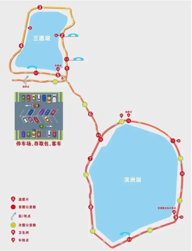 赛道起终点设在萨尔图区萨政路兰德湖路段辅路,途经兰德湖和滨洲湖,赛道密闭、平坦宽阔,沿途景色优美,赛道体验优良。赛道共设3处补给点,分别在起终点、5公里、16公里处。截至目前,已有1500名运动员报名参赛。