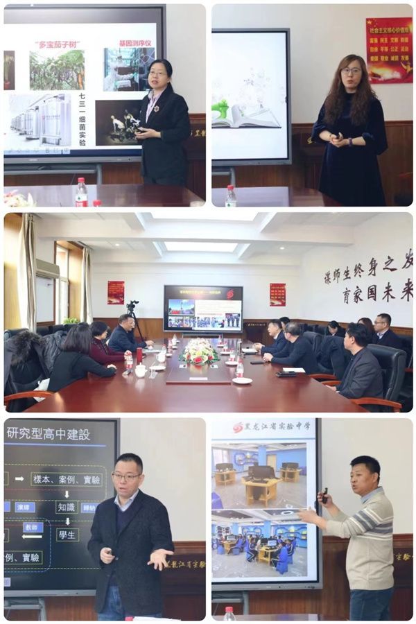 黑龙江省实验中学的老师分别从德育大思政建设、生物学科、地理学科校本课程的建设,跨学科创新课程的开展等方面介绍省实验教育教学研究的实践和成果。广大中学领导对省实验中学富有教育意义的学生活动,各科实验室的建设,丰富的校本课程的开展等等颇感兴趣,双方热烈分享了各自培养和提升学生核心素养的做法。教育中许多共通之处让彼此距离进一步拉近。