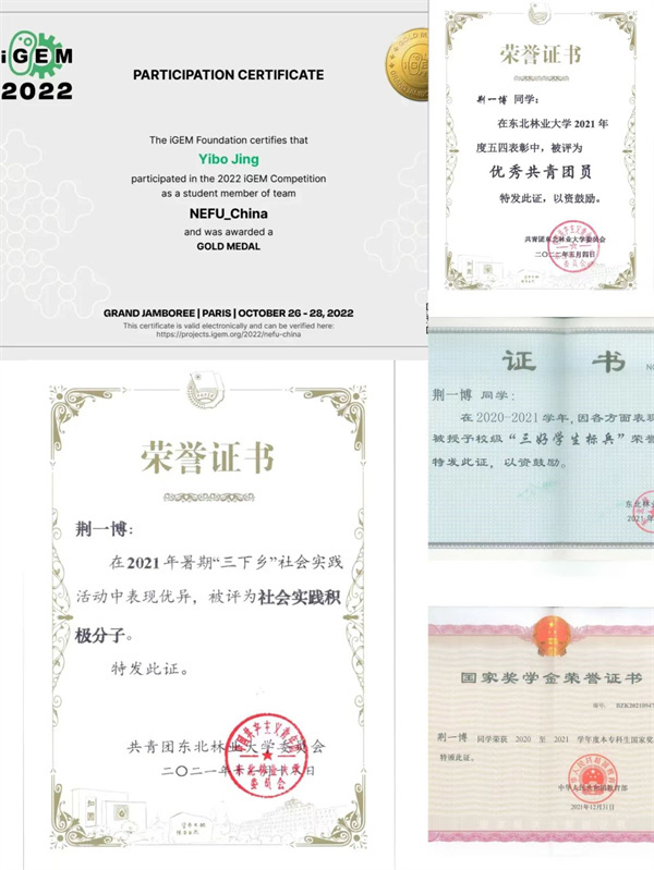 发表SCI论文(一作)及北大核心论文(三作)各1篇、获2022年iGEM国际金奖、参与完成一项国家级大创项目、获国家奖学金、校优秀学生特等奖学金、校一等奖学金、校牵手奖学金、黑龙江省三好学生、多次获得校优秀团员、校三好学生、校社会实践积极分子、第五届全国高校商务英语竞赛决赛三等奖、“外研社·国才杯”全国大学生英语演讲比赛校级三等奖、推免综合排名专业第一,目前保研至清华大学(直博)——他就是东北林业大学奥林学院2020级生物技术专业的荆一博。四年磨剑,保研清华,让我们一同走进他的故事……