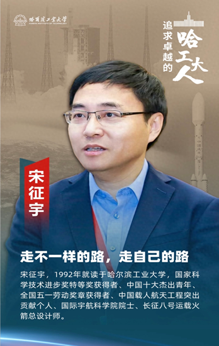 他曾获国家科学技术进步奖特等奖,中国十大杰出青年全国五一劳动奖章,中国载人航天工程突出贡献个人等多项荣誉。参与完成了从“神舟一号”至“神舟十一号”的发射,他是国际宇航科学院院士、长征八号运载火箭总设计师哈工大校友宋征宇。