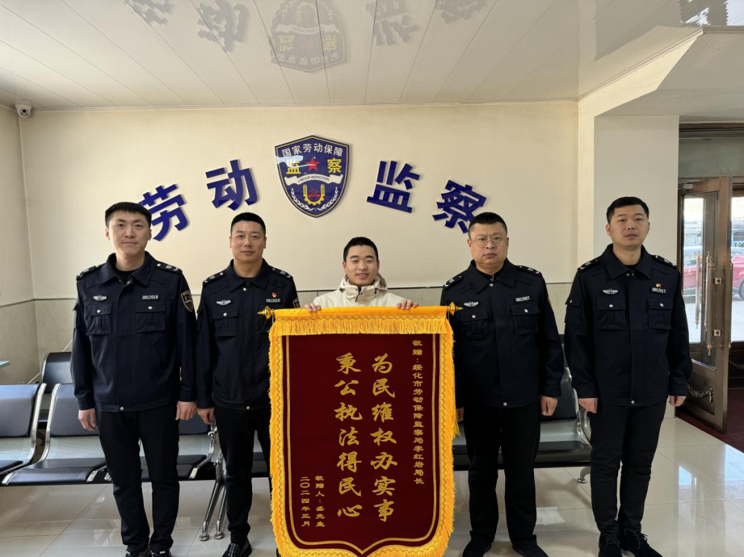 近日,盛先生来到绥化市劳动保障监察局,将写着“为民维权办实事、秉公执法得民心”的锦旗递到了劳动保障监察工作人员手中,表达了对劳动监察局工作的认可和感谢。