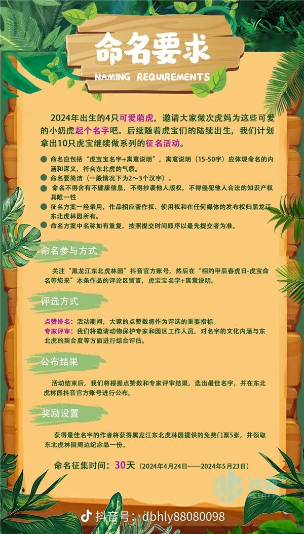 工作人员现场发出邀请,邀大家参与到线上“甲辰虎宝命名征集活动”中。命名对象暂定为今年刚出生的4只可爱萌虎,对于其他虎宝宝的命名,东北虎林园还会陆续做系列的征名活动。