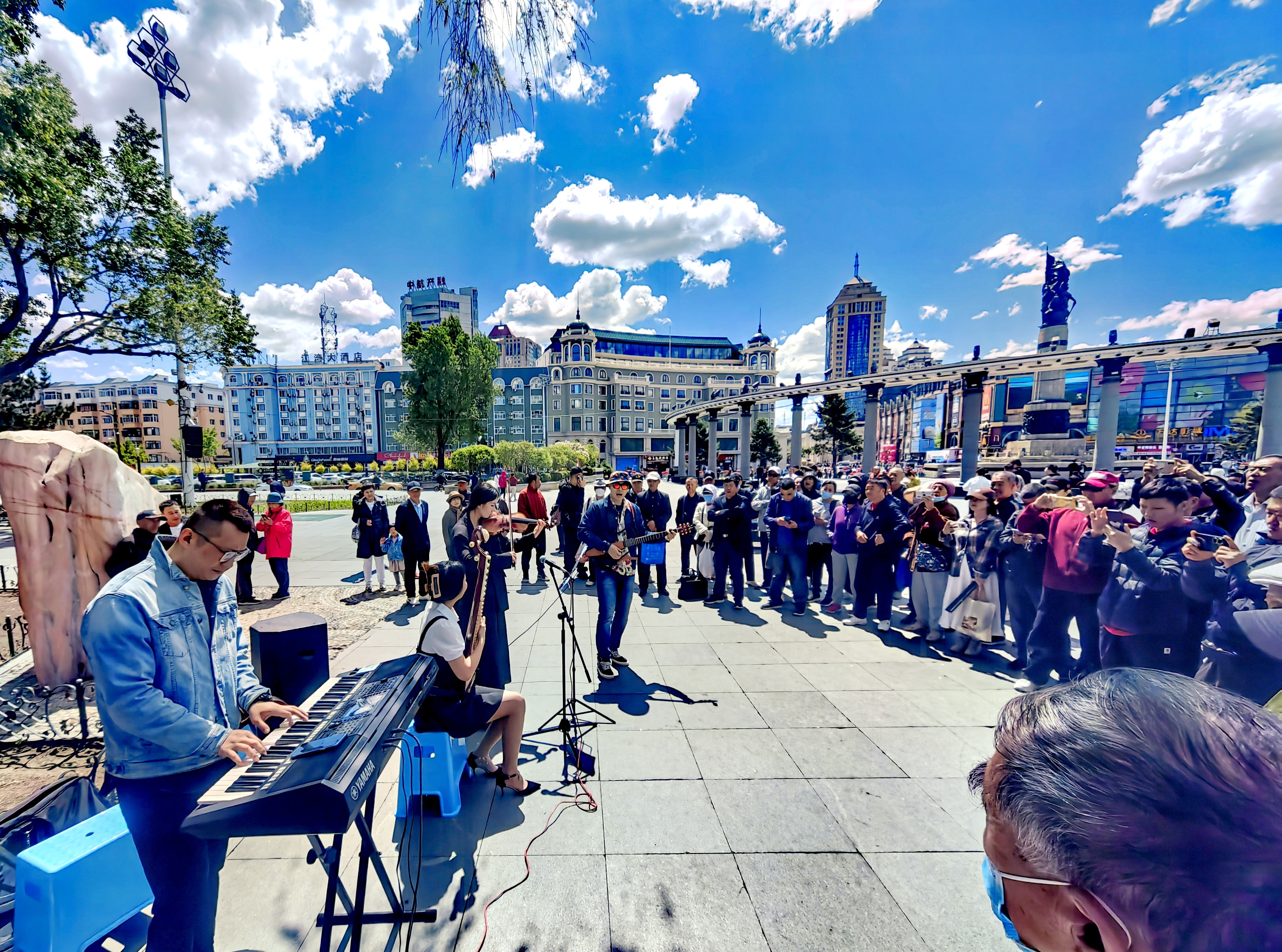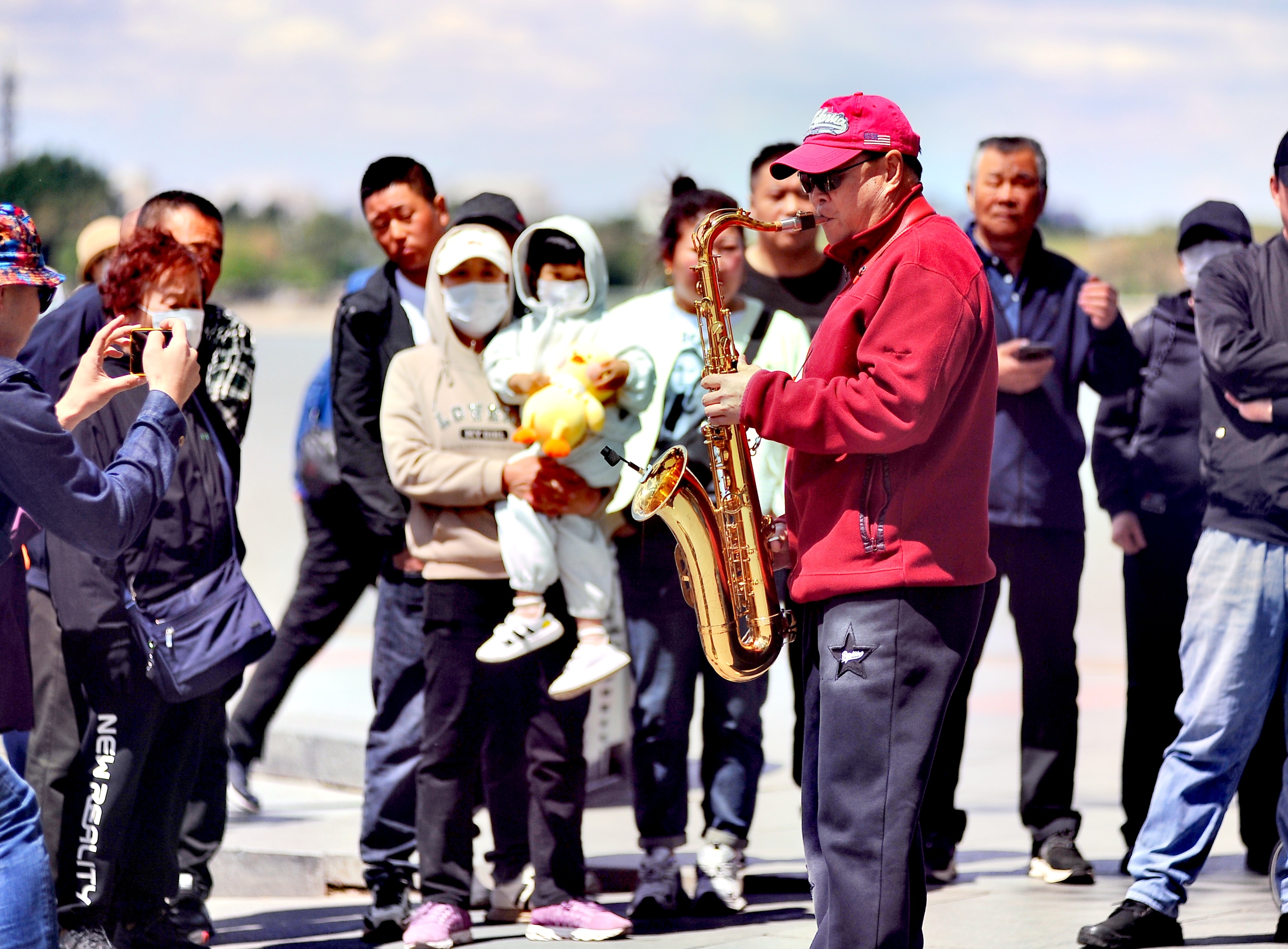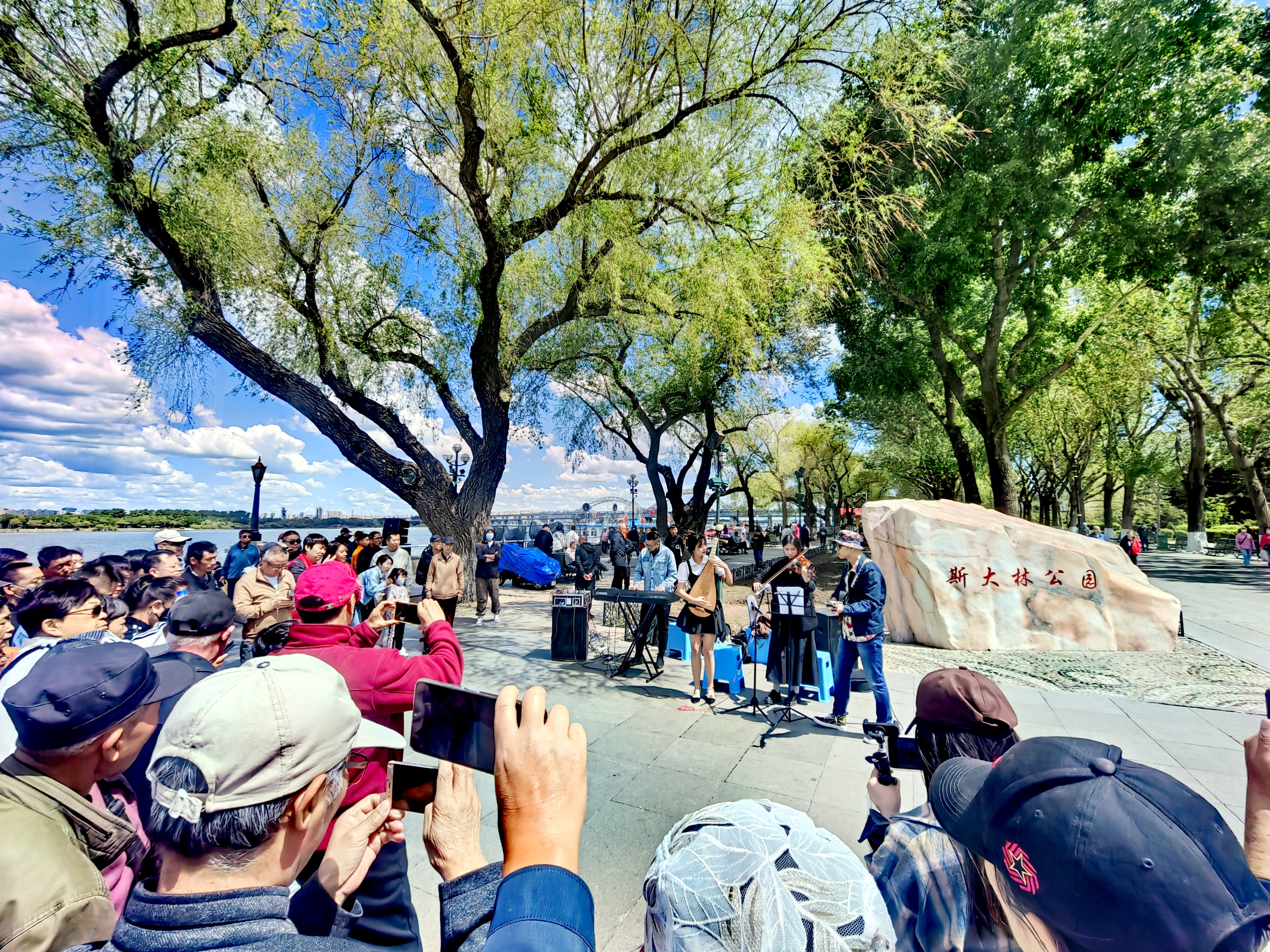 15日,哈尔滨市道里区松花江畔,一支小乐队正在进行演出,吸引许多游客观看。乐队的五名成员奏响小提琴、琵琶、电子琴、萨克斯等乐器,悠扬的乐曲声回荡在空中,让人们感受到音乐之城的艺术魅力。