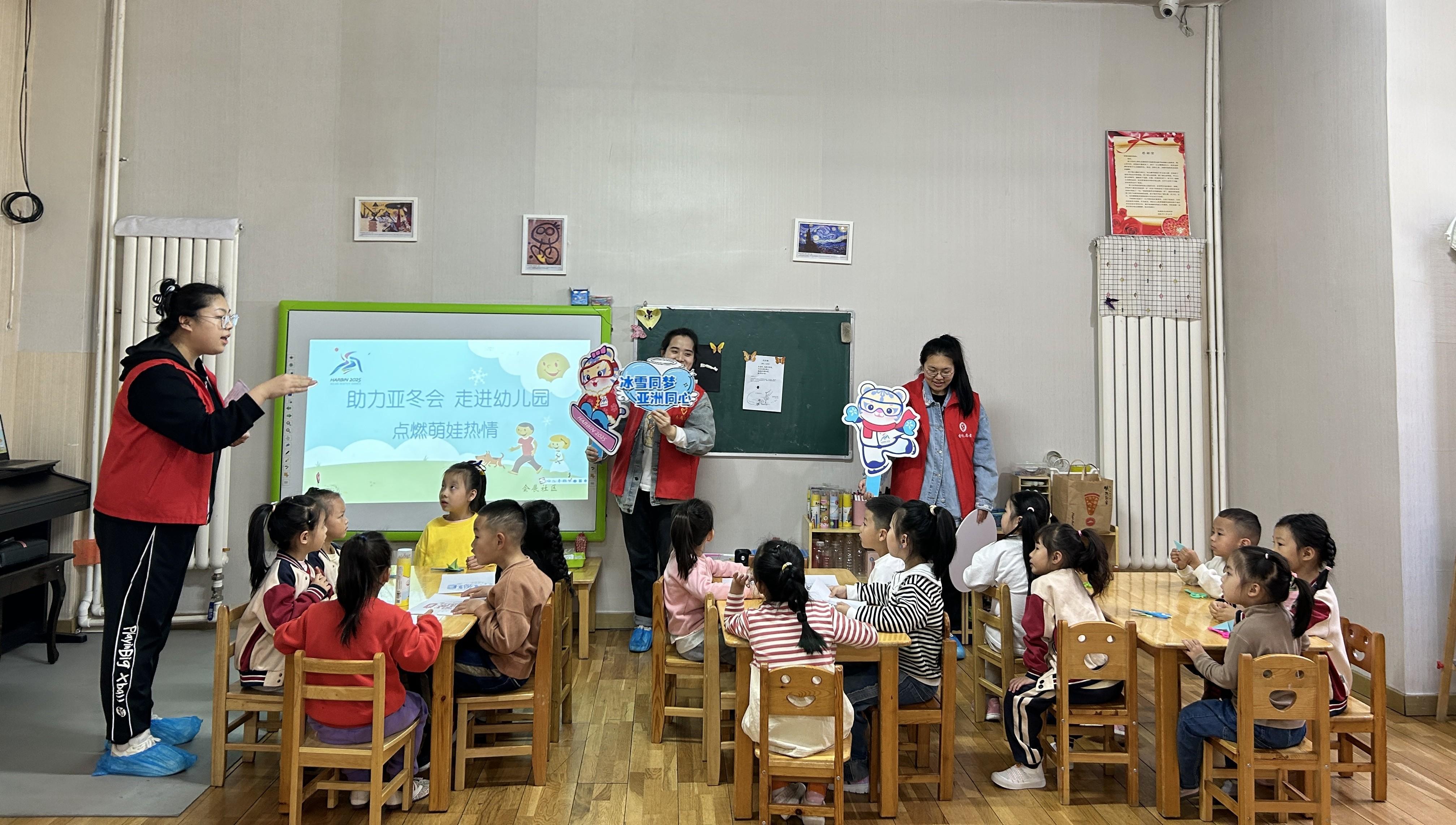 为了让小朋友感受家乡即将举办亚冬会的喜悦与自豪,丰富和活跃社区幼儿精神文化生活、传播亚冬会精神,5月29日,哈尔滨市香坊区新香坊街道会展社区联合梦想儿童之家幼儿园开展“助力亚冬会 走进幼儿园”宣传活动,营造喜迎亚冬会的浓厚氛围。