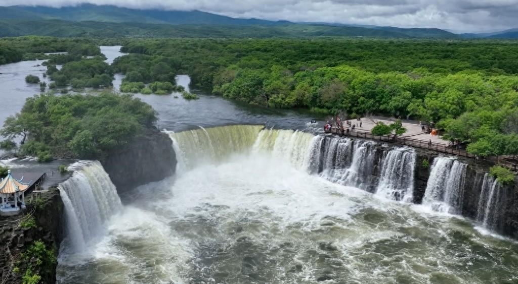 由于连日降水,镜泊湖吊水楼瀑布在今年首次出现三面飞瀑的景观,站在观景长廊能看到三面环水的壮观景象。近看,瀑布水流一路狂奔,气势恢宏;远观,隆隆千里,犹如一曲无与伦比的雄浑交响,震撼无比。