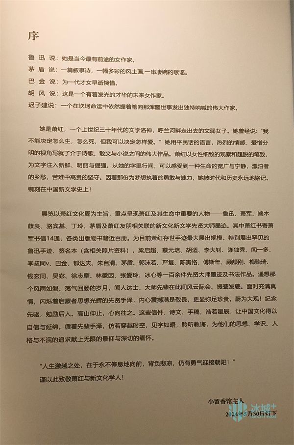 本次展览旨在回顾和展示20世纪中国新文化运动时期的杰出人物及其手迹作品,以此向这段波澜壮阔的历史致敬。展览展出萧红书信14封、萧红各类出版物书籍近百册,鲁迅信件1封、签名本两件及照片相关资料,萧军、端木蕻良、洛宾基、丁玲等手迹作品。同时,还展出与萧红、鲁迅相关的新文化学人,如梁启超、蔡元培、胡适、陈独秀、巴金、郁达夫、朱自清、茅盾、严复、陈寅恪、傅斯年、顾颉刚、梅贻琦、钱玄同、吴宓、徐志摩等共60余位先贤大师名人百余件作品。全部作品均原迹呈现,弥足珍贵,展览不仅是对萧红与新文化名人的缅怀,更是一次深入了解和感悟20世纪中国新文化运动的历史机遇。