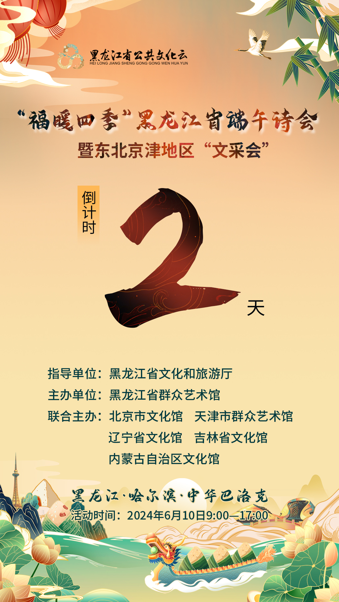 6月10日上午10时,由黑龙江省文化和旅游厅指导,黑龙江省群众艺术馆联合北京市文化馆、天津市群众艺术馆、辽宁省文化馆、吉林省文化馆、内蒙古自治区文化馆共同主办的“福暖四季”黑龙江省端午诗会暨东北京津地区“文采会” 活动倒计时两天,诚邀各界朋友莅临。