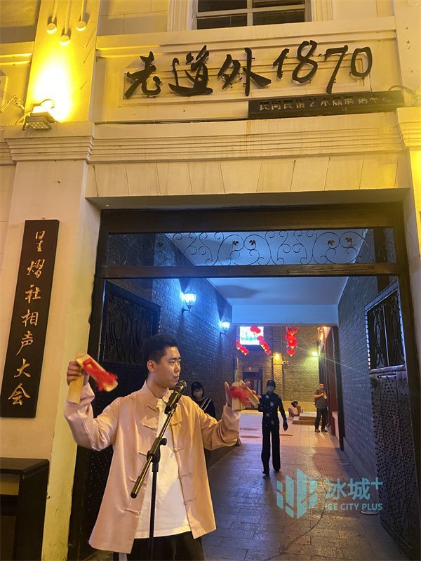 一家相声社前,两位演员妙语连珠,赢得掌声阵阵。“街头走唱,我们业内叫‘撂地’,现在也是吸引观众的一种方式。”工作人员说,相较平时,当晚相声社也临时增加了一场时长1小时的晚场演出。