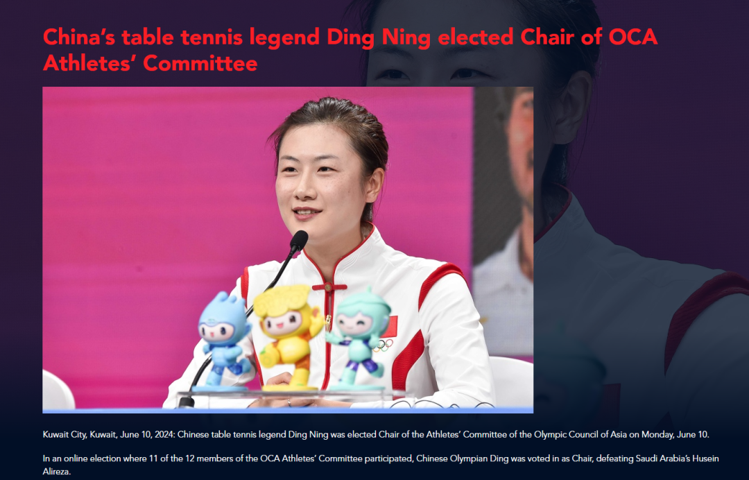 亚奥理事会近日宣布,前中国女子乒乓球运动员、大满贯得主丁宁当选亚奥理事会运动员委员会主席。