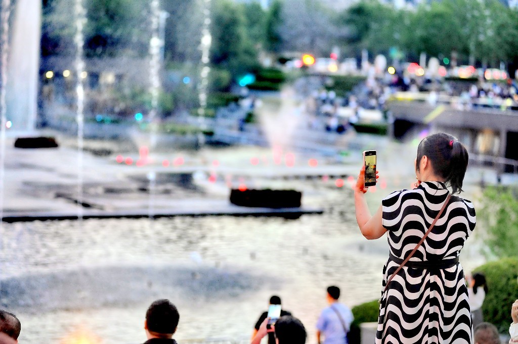 一边观赏着美丽的喷泉景观,一边享受着夏日里的清凉,市民、游客们围坐在四周,用手机记录下精彩瞬间。