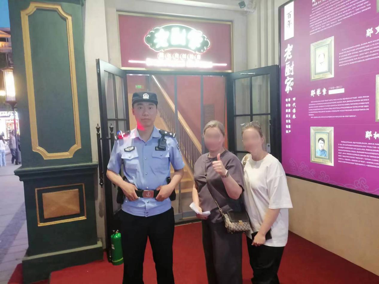 6月17日19时许,中央大街巡逻队民警吴伯远、辅警刘艺航巡逻至中央大街与西七道街交口处时,遇到两位俄罗斯游客求助,经游客展示汉字书写字条得知,两位游客想前往西四道街。民警吴伯远用英语与游客沟通后,将二人带领至西四道街,但游客表示并没有到达目的地。由于两位游客英语运用并不熟练,民警吴伯远无法与其有效沟通了解其目的地,于是吴伯远立即电话求助精通俄罗斯语的妹妹与两位游客沟通,得知两位游客是想前往老厨家餐厅就餐。经推断,两位游客应是想前往位于西三道街的老厨家餐厅,吴伯远与刘艺航再次将两位游客带领至西三道街的老厨家餐厅,到达后经英语交流,确认此处为两位游客的目的地。两位俄罗斯游客表示十分感谢并与执勤民警合影留念。