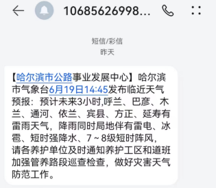 自6月19日起,每逢极端恶劣天气,黑龙江省、哈尔滨市公路部门相关人员以及各区县(市)管理机构、养护工区、养护道班安全管理人员的手机都会收到天气预警短信息,便于第一时间动态分析研判天气变化及对公路通行能力带来的影响,及时启动应急响应,提前安排部署,防范应对到位,提高应急处置效率,做到早发现、早预警、早处置,筑牢哈尔滨市公路安全畅通第一道防线。