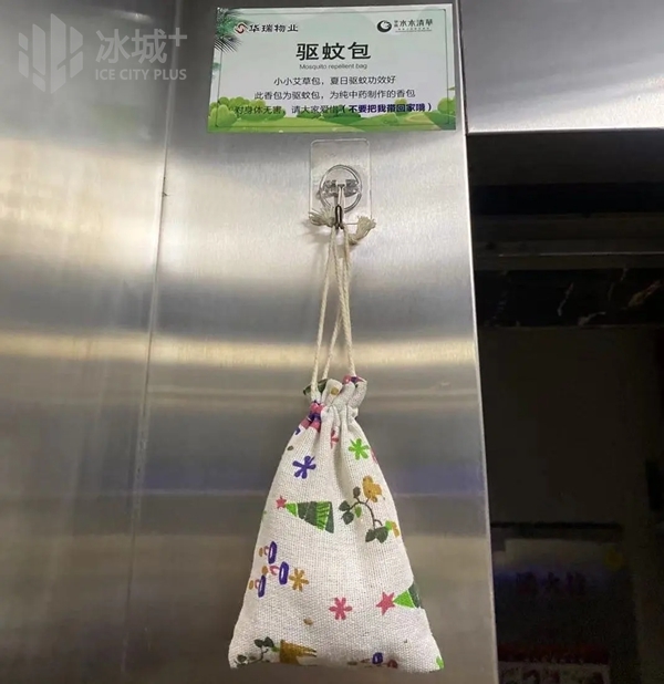 与此同时,华瑞物业还开展了“默默无蚊”行动,配制了中药驱蚊包,并悬挂在每部电梯里,还专门贴出提示,“小小艾草包,夏日驱蚊功效好,此香包为驱蚊包,为纯中药制作的香包,对身体无害,请大家爱惜(不要把我带回家哦)。”