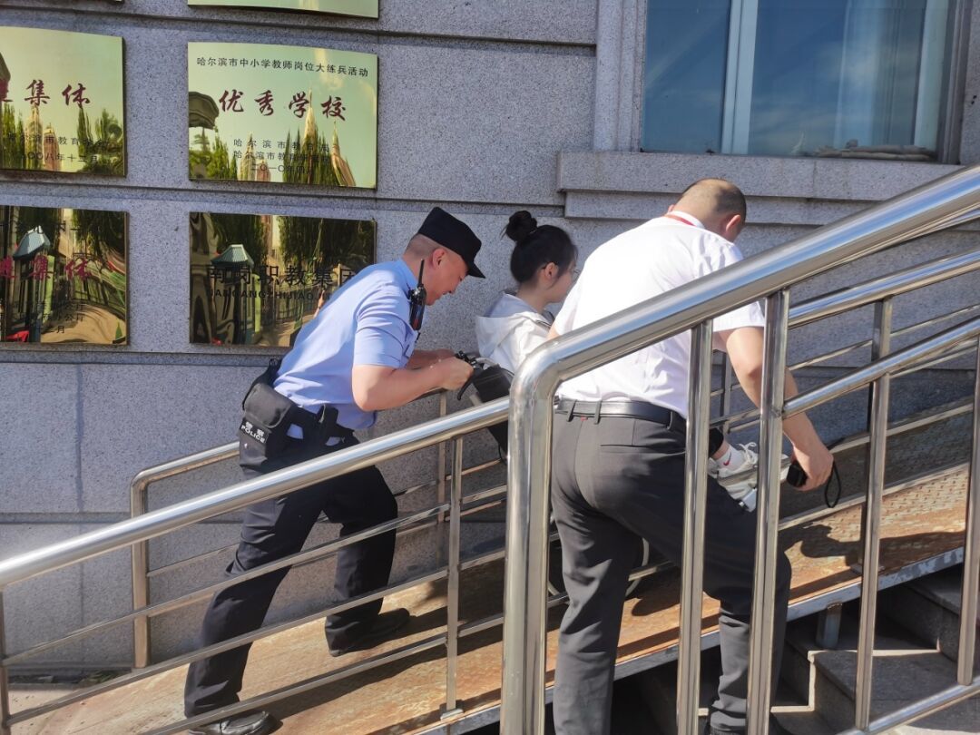 在道外区七十二中考点,一名考生同样乘坐轮椅前往考点,正在执勤的道外分局大有坊街派出所民警立即上前帮助考生,将其顺利送入考场。