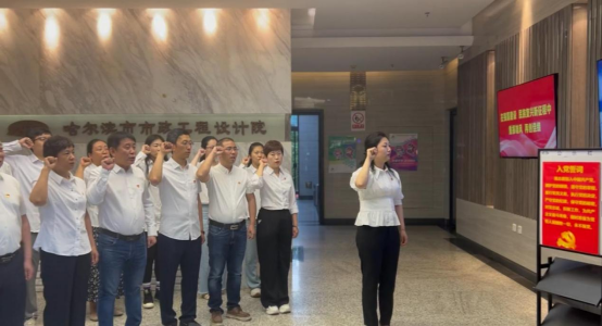 市政一公司党委开展迎“七一”重温入党誓词活动。在项目一线开展与党旗合影活动,党员亮身份、解难题,发挥在大项目攻坚带头作用。