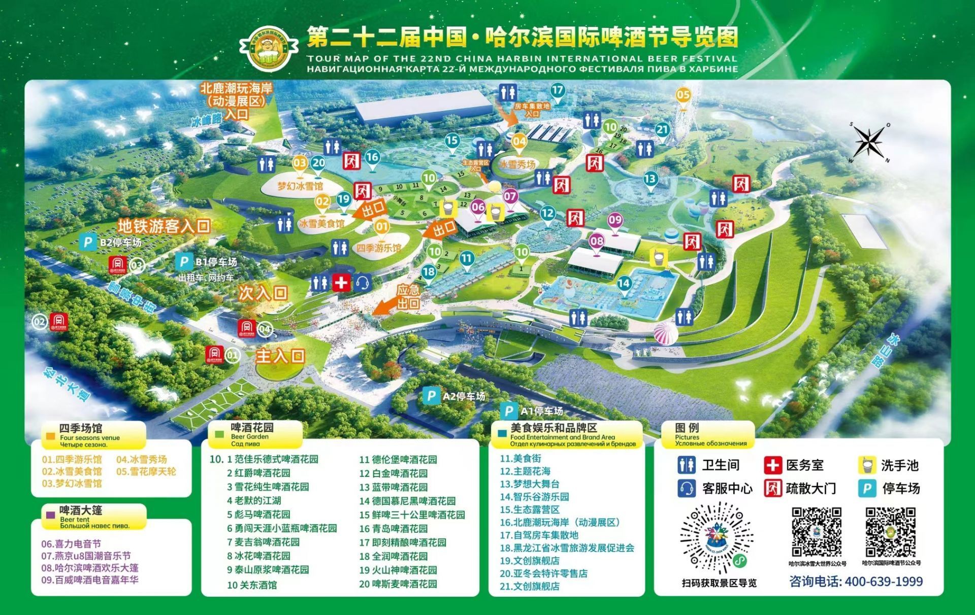 啤酒节位于哈尔滨冰雪大世界主园区,总占地面积30万平方米,为历届最大。本届啤酒节围绕“啤酒+电音”,打造历届最大的中心舞台——梦想大舞台,将举办多场大型电音节、音乐节等演艺活动;引入四个啤酒大篷、二十一个啤酒花园、生态露营区、自驾房车集散地、美食街、大型气膜水世界、国潮动漫展区等全新业态,四季冰雪项目同步运营,邀请世界各地的游客到这里汇聚,共享啤酒盛会带来的活力与激情。