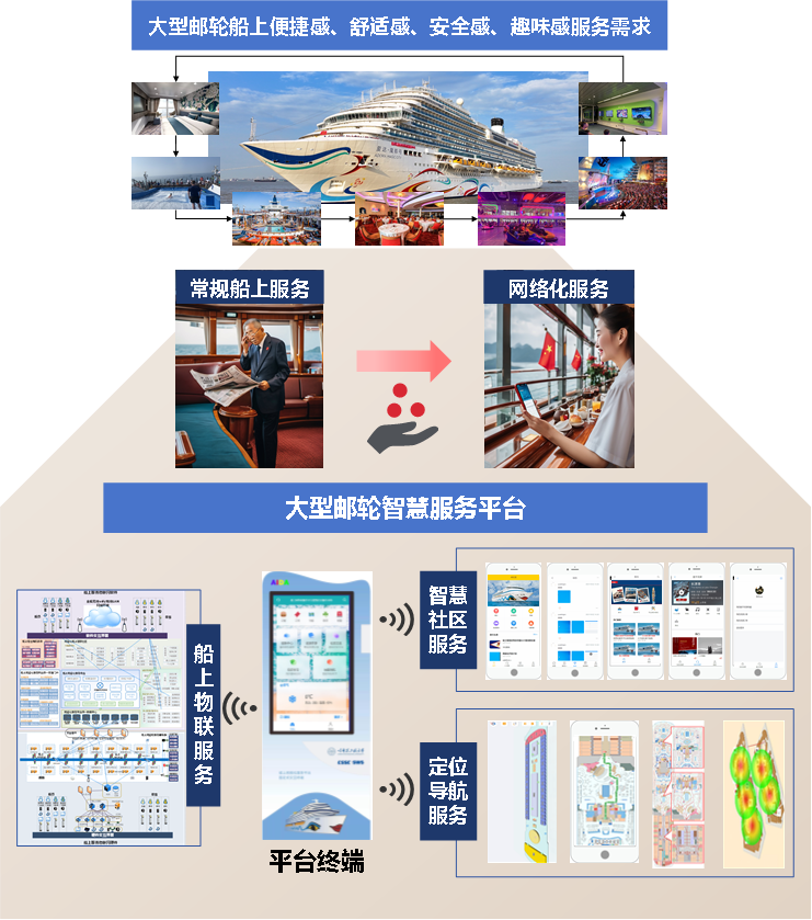针对大型邮轮船上服务手段与乘员习惯极度失匹导致的服务体验感断崖式落差问题,充分发挥“互联网+”技术在文化和旅游行业推动作用,平台具有船上物联网、船上智慧社区、船上定位导航等功能,有助于提高邮轮船上人员在便利度、舒适度、安全感、趣味感、认同感等方面的全方位满意度,已在中国首制大型邮轮“爱达·魔都号”上完成实船验证,在其L3实船Mockup上完成部署应用。