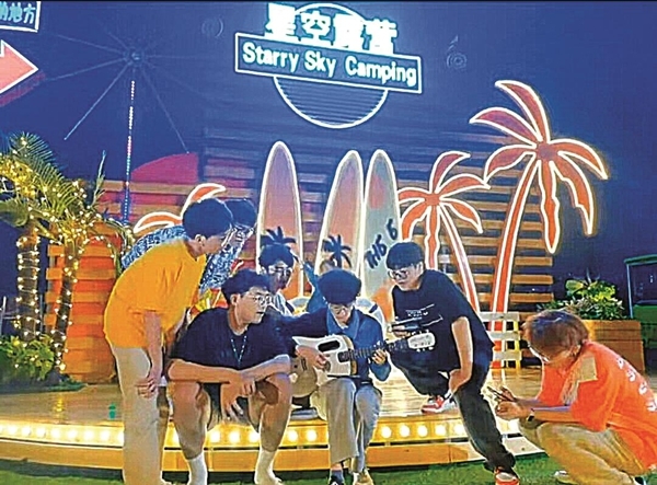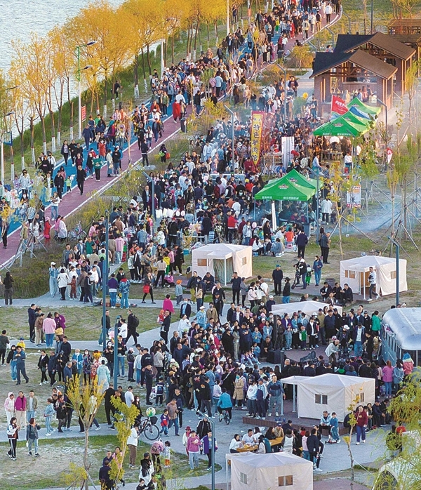 在龙凤湿地公园,帐篷上挂满彩灯,拧开随身音箱,青年男女手持荧光棒,在草地上狂歌热舞,露营游客纷纷加入,大家自称这叫“湿地星空舞会”;每天傍晚,三永湖、滨洲湖等处都格外热闹,萨克斯、长笛、吉他、架子鼓等器乐演奏随处可见,有孩童也有老者,漫步湖边,既可欣赏风景,又可免费听歌看表演。