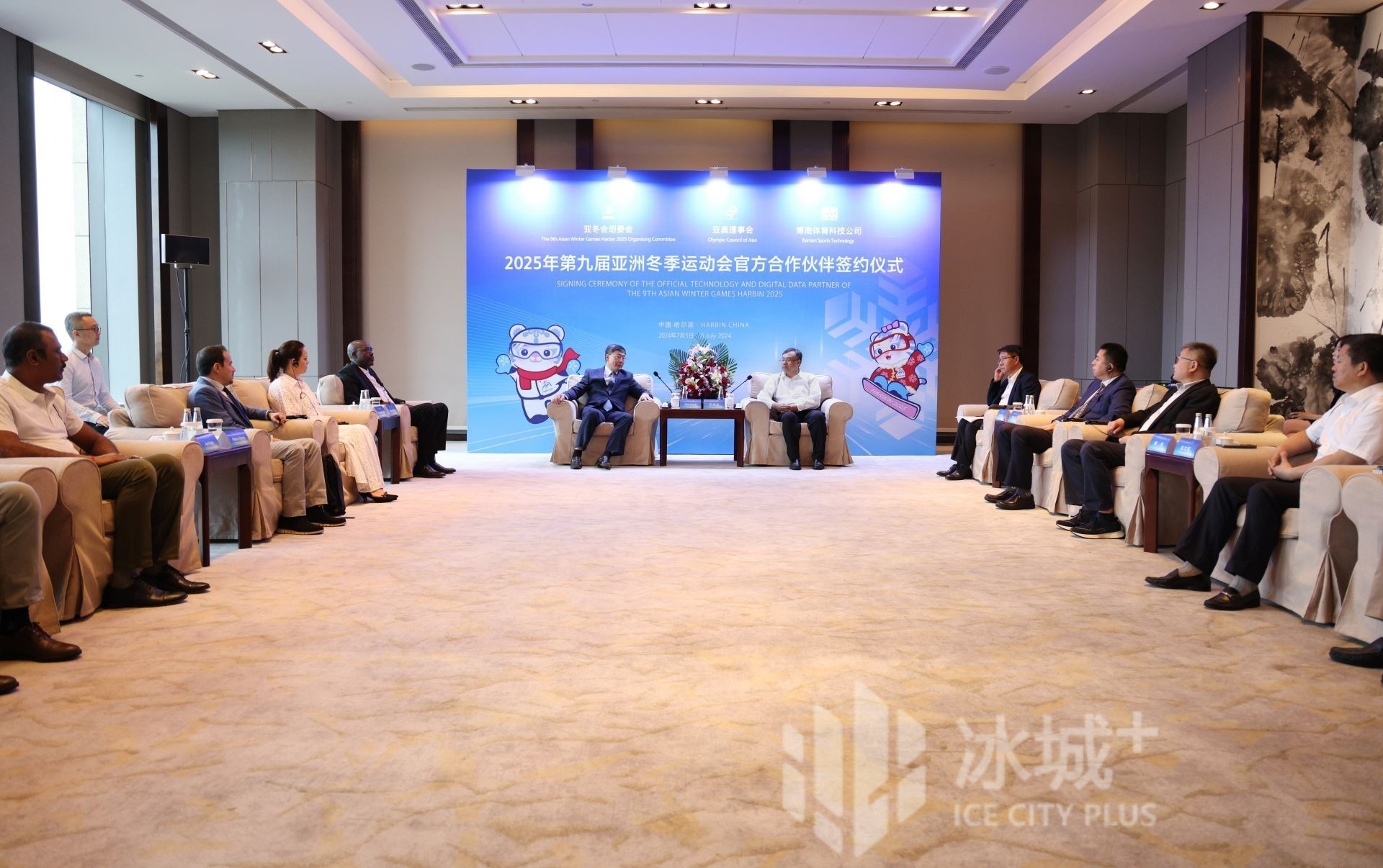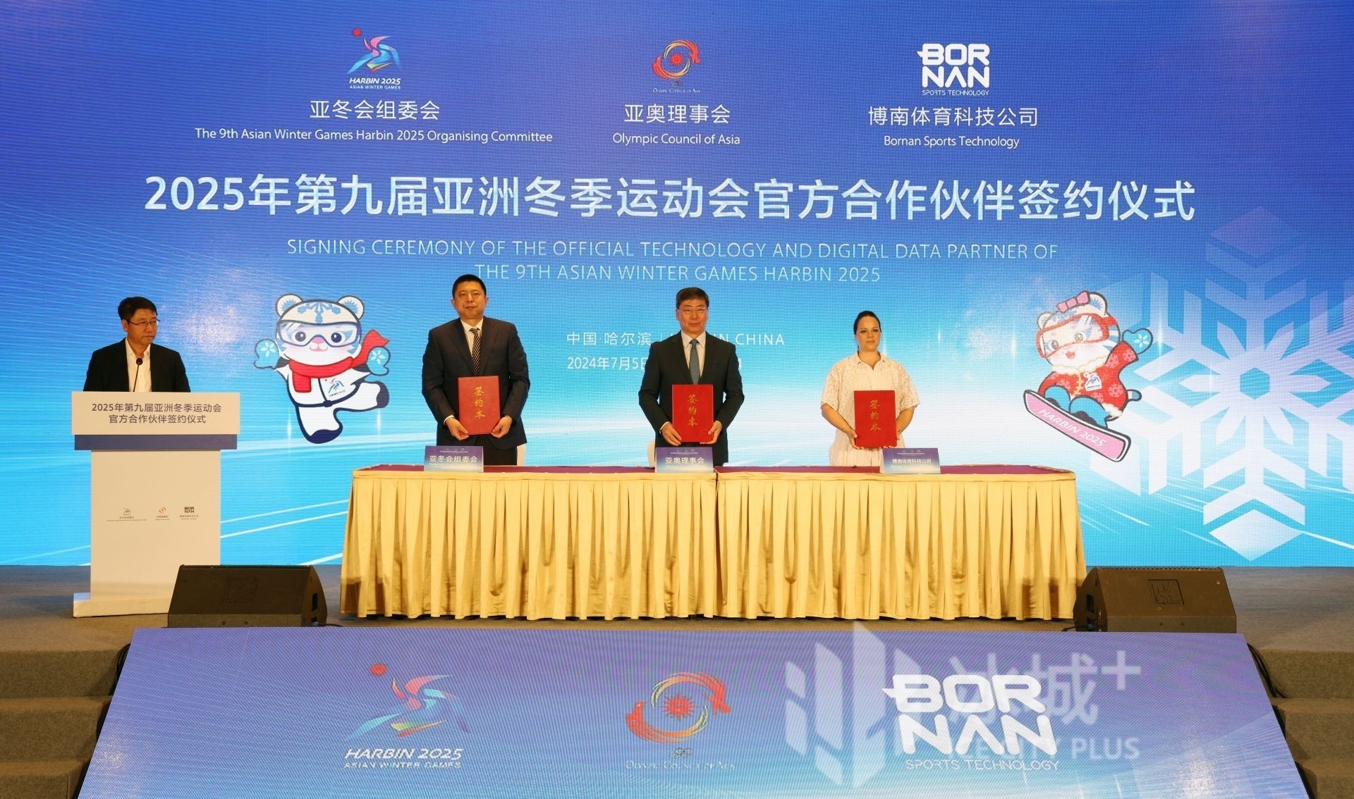 7月5日,2025年第九届亚洲冬季运动会官方合作伙伴签约仪式举行,亚冬会组委会、亚奥理事会、博南体育科技公司共同签约。亚奥理事会副主席、体育委员会主席宋鲁增,2025年第九届亚冬会组委会副主席兼秘书长王合生,博南体育科技公司创始人兼首席执行官伊娃·玛利亚·科尔多瓦出席并先后致辞。