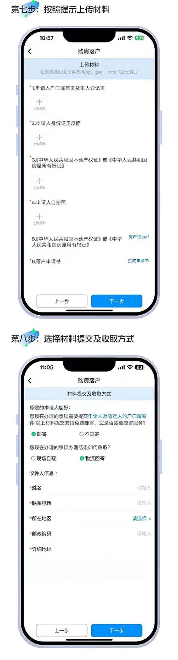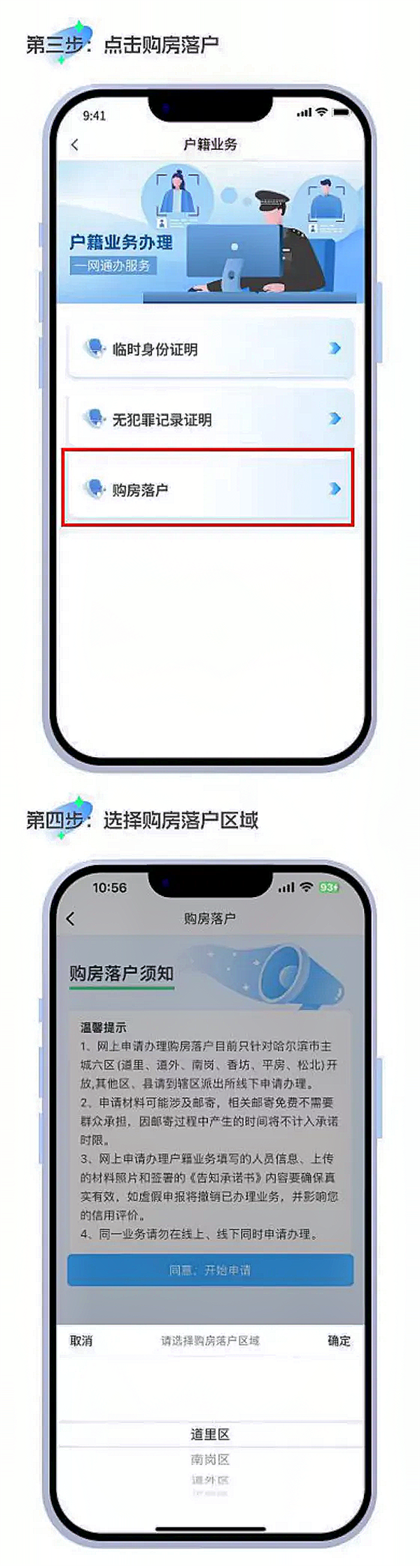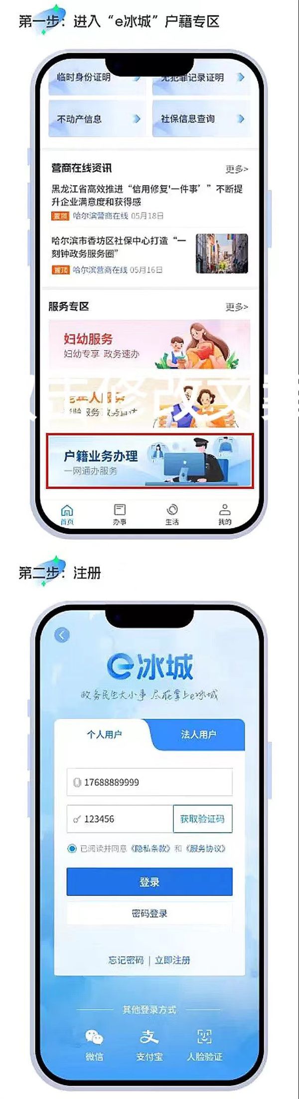 下载“e冰城”APP后,进入平台首页,在服务专区中找到户籍业务办理,进入户籍专区,阅读网办须知,选择购房落户,按照提示确认、填写相关信息,拍照上传证明材料,最后选择材料提交及收取方式即可完成申请。