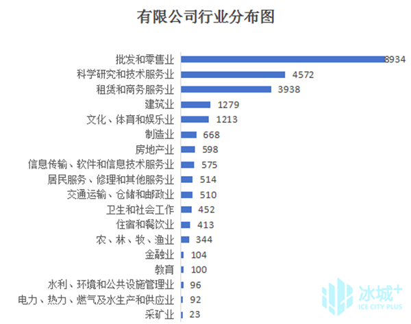 按照《国民经济行业分类》,上半年哈市新设立有限公司排在前三位的行业是:批发和零售业8934户,占有限公司总量36.58%;科学研究和技术服务业4572户,占有限公司总量18.72%;租赁和商务服务业3938户,占有限公司总量16.12%。在新设立的有限公司中,第一产业344户,占总量1.41%;第二产业2062户,占总量8.44%;第三产业22019户,占总量90.15%。