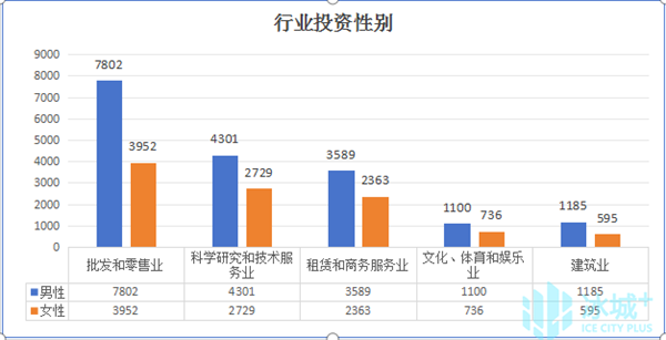 在上半年新登记的有限公司中,股东为自然人投资的共34766人次,其中男性21902人次,女性12864人次。年龄在30-40岁之间的投资者最多。为11776人次。按照行业投资男女性别比例:批发和零售业男性占比66.38%;科学研究和技术服务业男性占比61.18%;租赁和商务服务业男性占比60.3%;文化、体育和娱乐业男性占比59.91%;建筑业男性占比66.57%。
