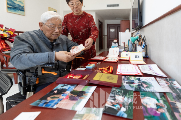 白韧老人将红彤彤的证书工工整整地摆放在马淑敏生前获得过的荣誉证书中间。看着那铺满整张桌子的奖状与奖章,白韧与马淑敏两人的人生旅程仿佛一幕幕地浮现在我们眼前。