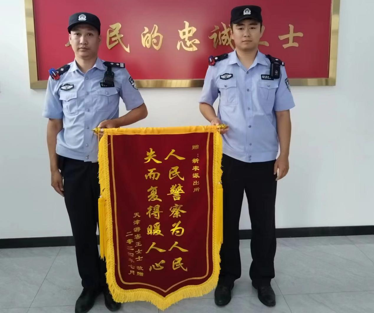 7月26日,哈尔滨市公安局道里分局新农派出所收到一件特殊的快递包裹。打开一看,原来是天津游客王女士寄来的一面感谢锦旗,包裹内还附带一张卡片上写着“感谢警察同志帮孩子找回电话手表,给你们点赞!”