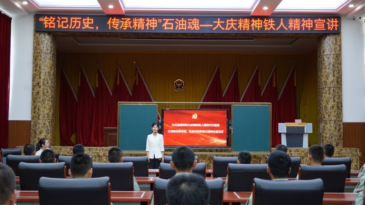 此次活动讲解员走进大庆市武警支队,并通过线下及线上的方式进行“石油魂—石油精神和大庆精神铁人精神”主题宣讲,现场通过大量珍贵的历史照片和视频,带领武警士兵们全面了解大庆油田从发现到开发的辉煌历程,以及石油工人在艰苦环境下不屈不挠、勇于开拓的精神面貌。