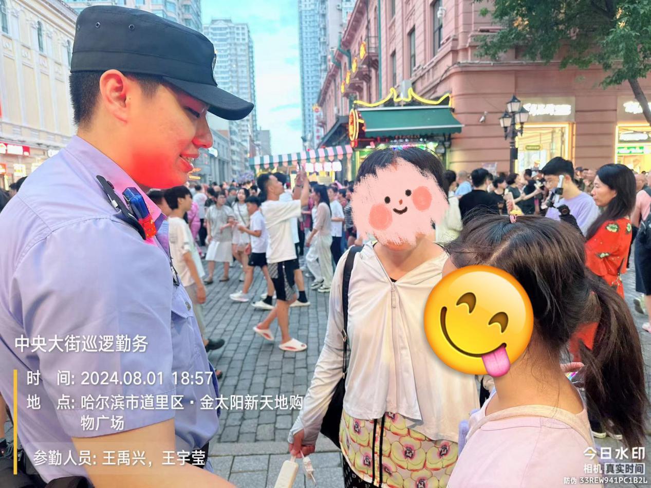 8月1日18时许,中央大街巡逻队巡逻民警王禹兴、王宇莹在巡逻过程中遇到一名小女孩求助,称与母亲走散。经询问得知其母女是天津来哈游客,在中央大街游玩时与母亲走散,民警通过女孩佩戴的手表电话与其母亲取得联系,并约定好碰面地点,将孩子平安送至母亲身边。“感谢警察同志!刚开可吓死我了,我一定看好孩子!”母亲拉着女儿的手向民警连连道谢。