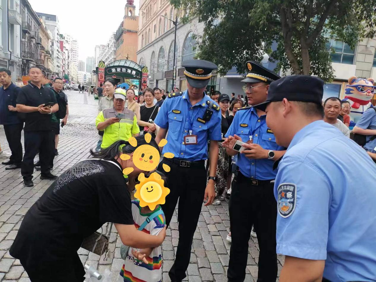 8月3日15时许,中央大街巡逻队巡逻民警胡斌、刘艺航在巡逻过程中,遇见执法局同志称有儿童走失,民警立即前往现场并联合执法局同志帮助走失儿童寻找其家人,最后在金安商场附近发现一名神色焦急四处张望的女士,疑似是走失儿童家长。经核查后,果然是走失儿童的家人,在民警将儿童平安地送到家长手中时,家长留下了感激的泪水。