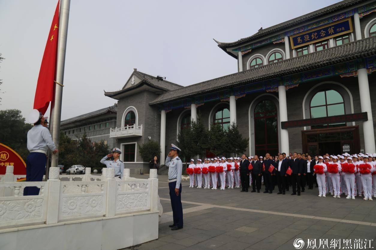 清晨,在马骏纪念馆广场,由75人组成的方队面向国旗肃立致敬,奏唱国歌,注视着国旗沿着旗杆缓缓升起。