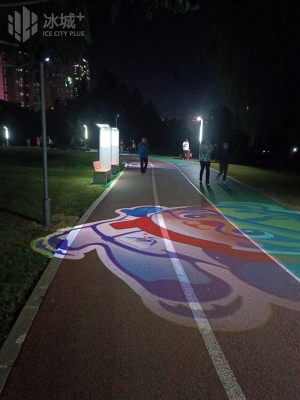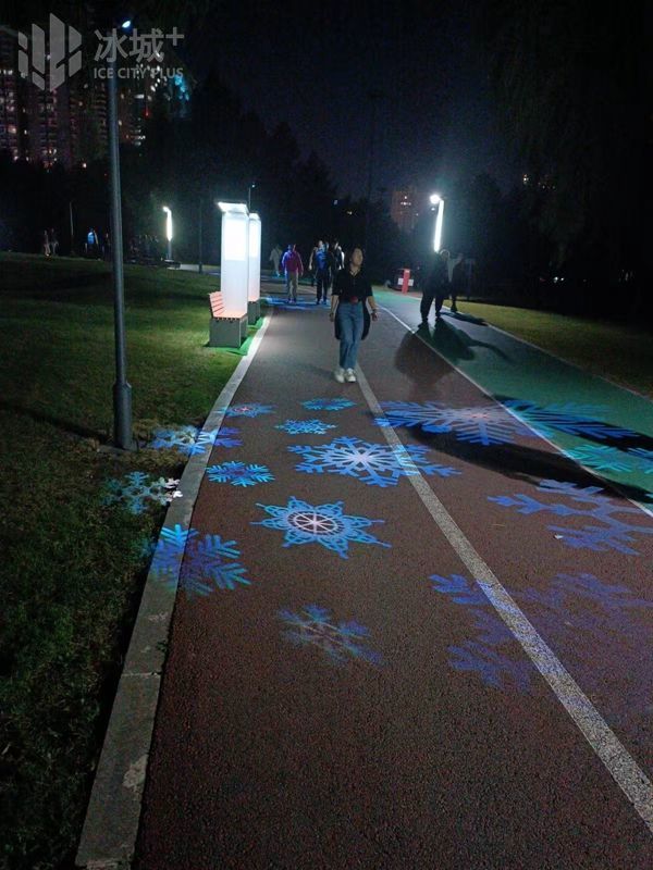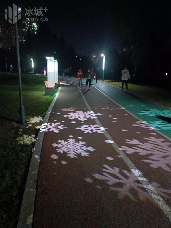夜色中,在湘江公园内红绿相间的漫道上,五颜六色的雪花图案铺满了路面,这些雪花图案都是由一个个投影灯投射在地面上的。在公园的另一处漫道上,一个大型的亚冬会吉祥物光影图案投射在路面上,美轮美奂!“简直太美了,晚上在这里锻炼心情也更好了!”一位在公园内散步的女士说。