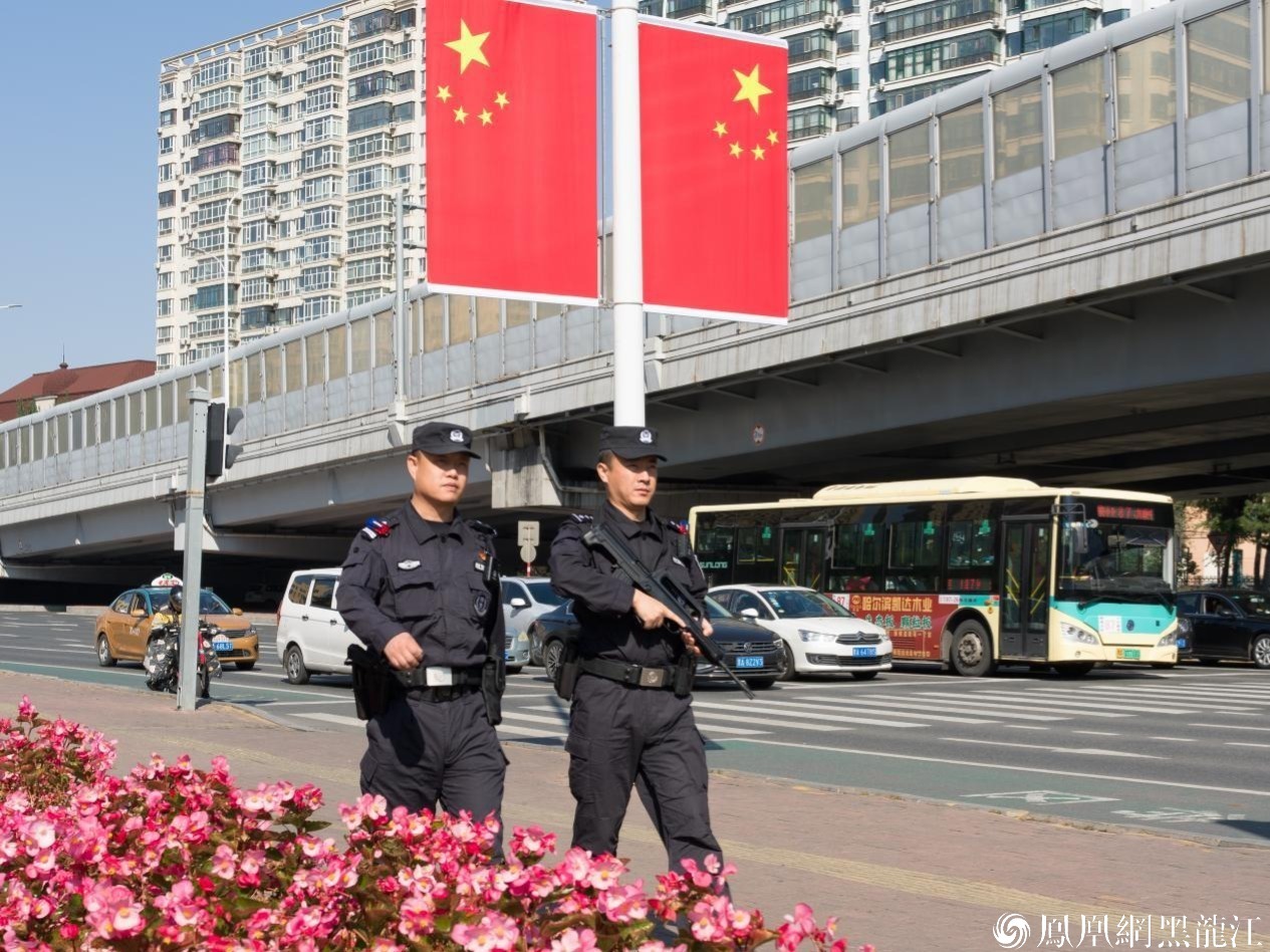 在国庆氛围浓厚的哈尔滨,“中国红”与“警察蓝”交相辉映,一抹抹“藏蓝”守望着城市的大街小巷,守护着国庆佳节的平安稳定。
