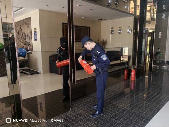 “这个灭火器已经过期,您看一下,指针不在有效区域,要立即更换。还有走廊拐角那个位置缺少安全出口指示灯,请立即整改。”通河县局民警在对一家宾馆进行检查时,及时向场所负责人指出发现的安全隐患,并对相关人员使用操作灭火器进行了指导。