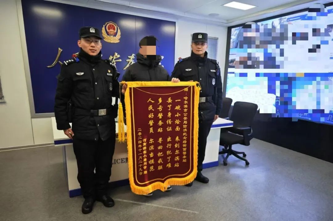 原来,唐先生的姐姐前不久到哈尔滨游玩时不慎将身份证丢失,十分着急。幸运的是,被巡逻中的防洪纪念塔街面警务站民警捡到,民警随即通过移动警务终端联系到了唐女士,归还了身份证。一张小小的身份证见证了冰城民警的责任心与使命感,拿到身份证的唐女士感动不已,因急于返回河南,便让弟弟制作了一面锦旗送给民警。