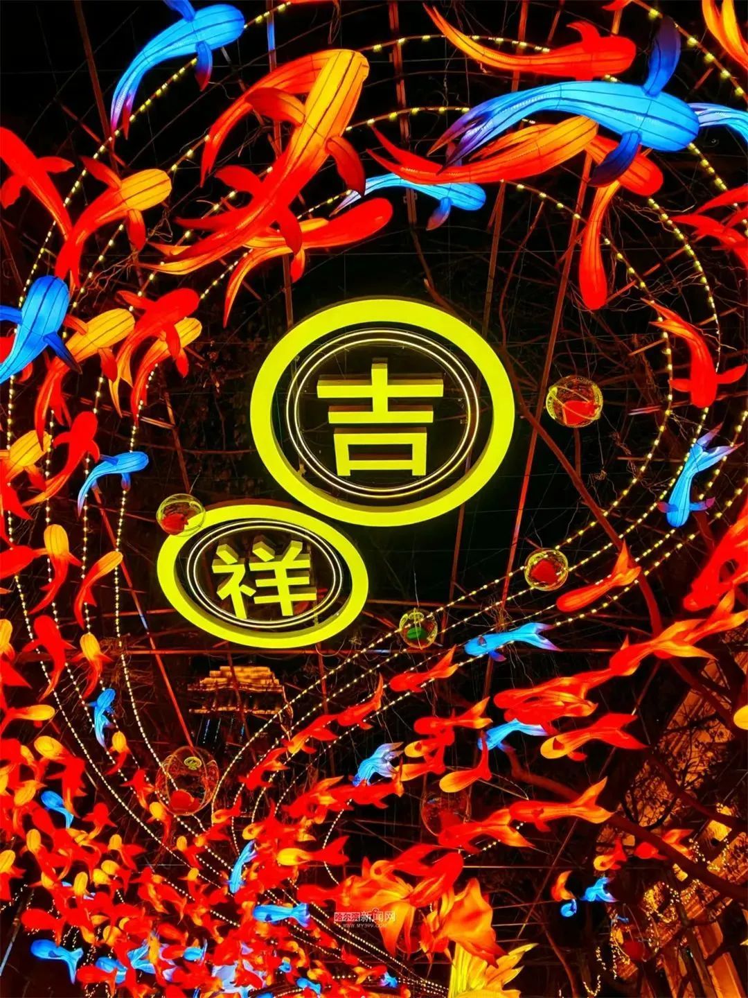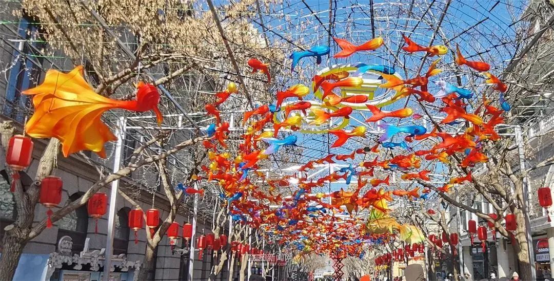 设计理念出自庄子《逍遥游·北冥有鱼》,弘扬中华传统文化,以专属定制的绢布鱼灯和鲲鹏为主要元素,呈现出神兽鲲鹏带领群鱼绕“福”字游动的奇幻画面,祝愿尔滨发展扶摇万里,蒸蒸日上。两侧的红灯笼和灯幔,写上新年愿望,祝福广大市民与远道而来的游客,吉祥如意,岁岁安康。