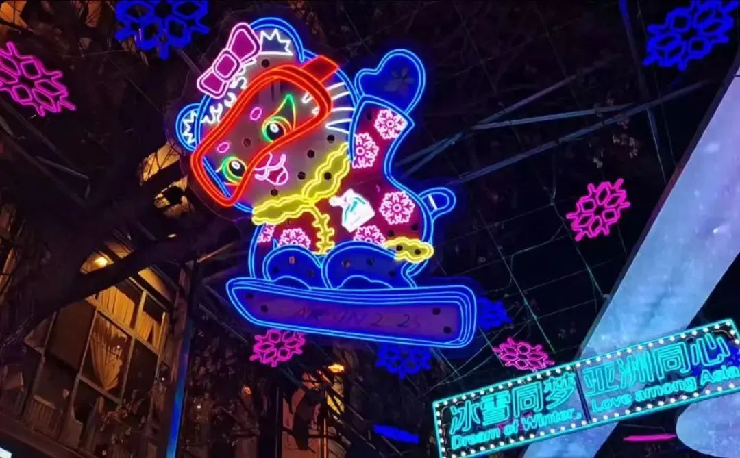 以亚冬会吉祥物滨滨和妮妮为形象基础,展现亚冬会冰上雪上六大项代表运动,结合冰雪赛道背景灯带及赛会口号,体现了冰雪运动的魅力与“冰雪同梦,亚洲同心”的亚冬精神。寄托了亚洲各国人民增进团结与友谊,推动文明互鉴和进步,表达了追求和平发展,共建人类命运共同体的愿景。