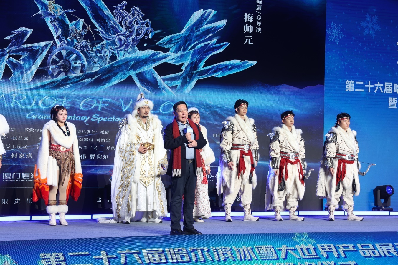 全新推出的数字文旅项目大型奇幻秀《王的战车》、“一冰雪一世界”沉浸式AI数字文化艺术馆、《冰龙寻珠·全感VR》进行了现场推介。