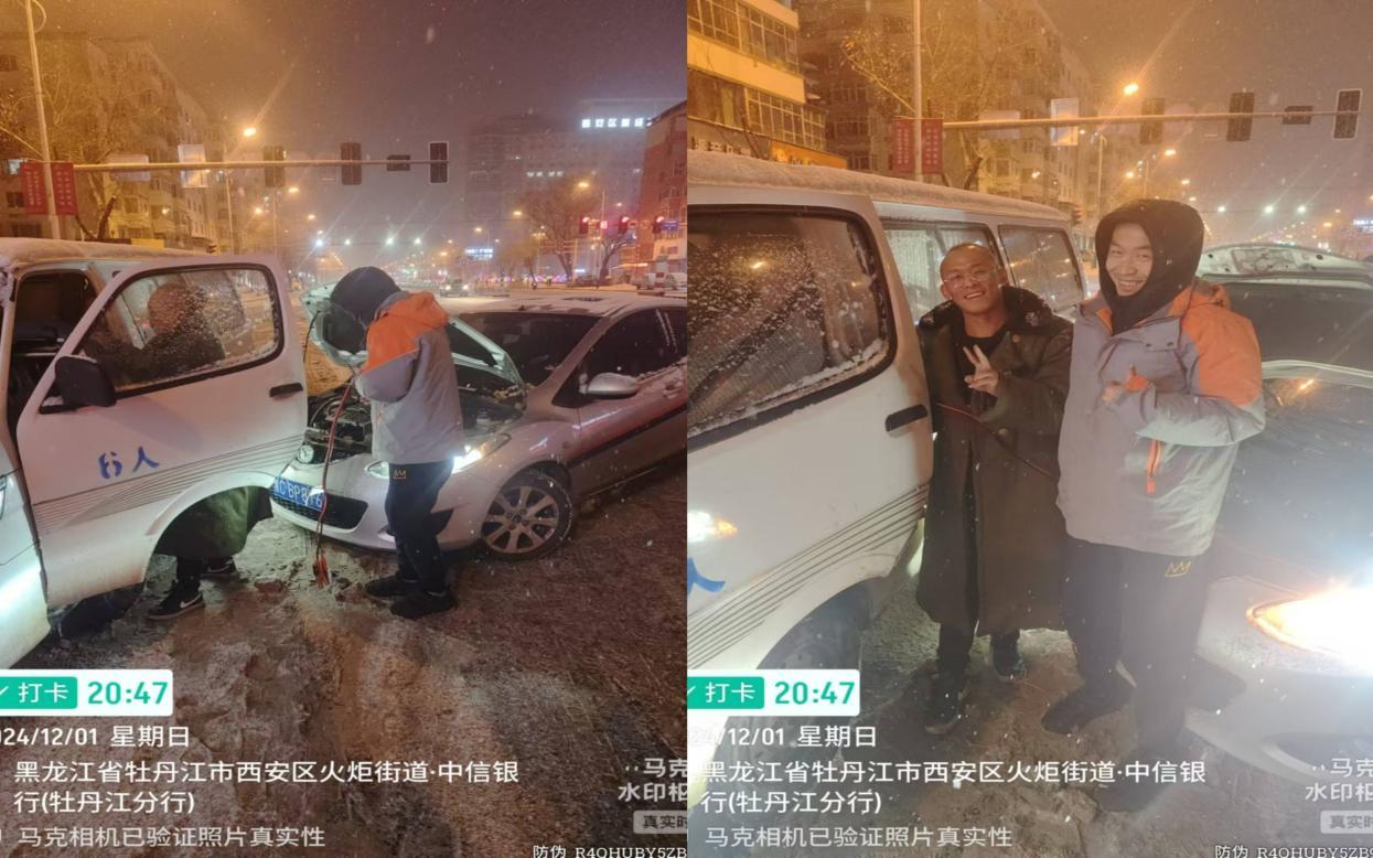 12月1日,客户车辆因电池故障在雪地中无法启动,陷入困境之时,牡丹江中支理赔作业组接到求助电话,团队迅速行动起来。他们第一时间赶赴现场进行接电操作。在接电过程中,工作人员还不断安抚客户焦虑的情绪,向客户讲解在雪天行车的注意事项和应急处理方法。最终,车辆成功接电启动。