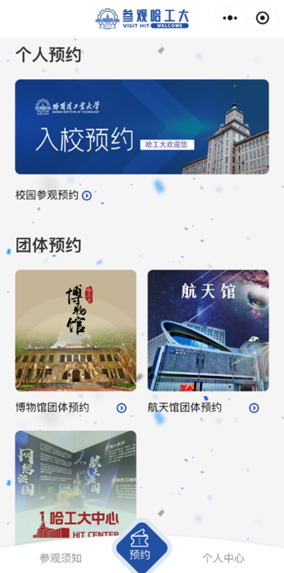 每日可申请预约当天及未来7天内参观。凭个人身份证和其他有效证件(如港澳居民来往内地通行证、台湾居民来往大陆通行证、港澳台居民居住证、外国人永久居留身份证、护照)通过“哈尔滨工业大学官方微信公众号-服务-校园参观预约-入校预约”进行个人参观实名预约。每人最多可为同行的另外3人预约。儿童须有成功预约的监护人陪同方可进校参观。对于恶意预约者,将限制预约并禁止入校。