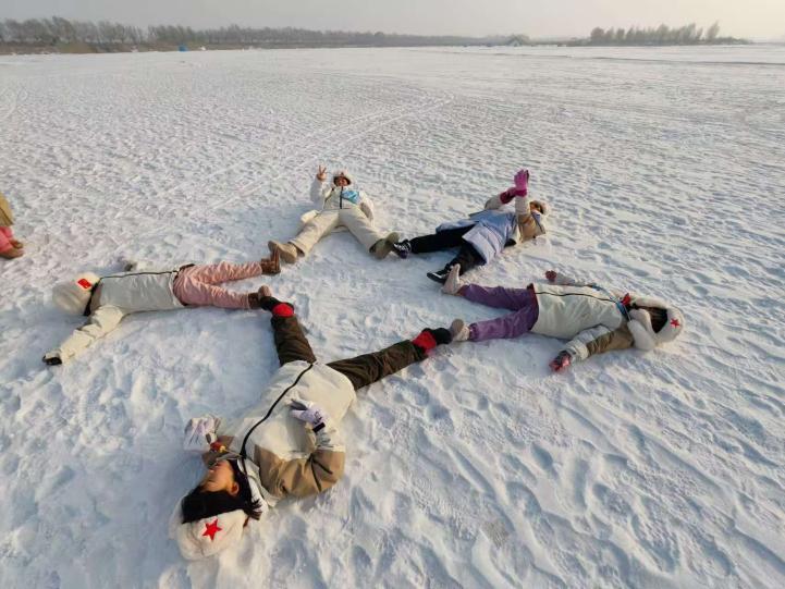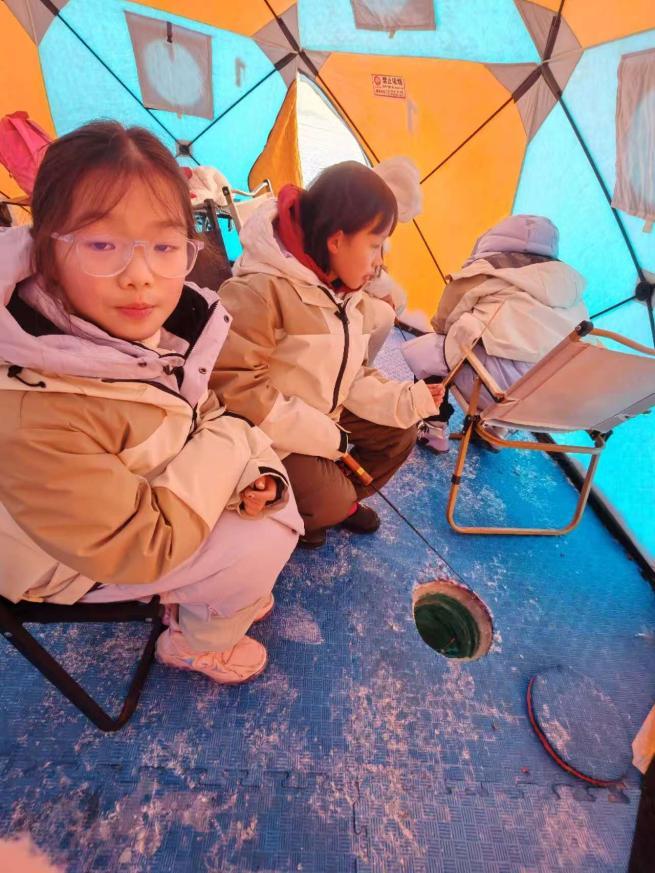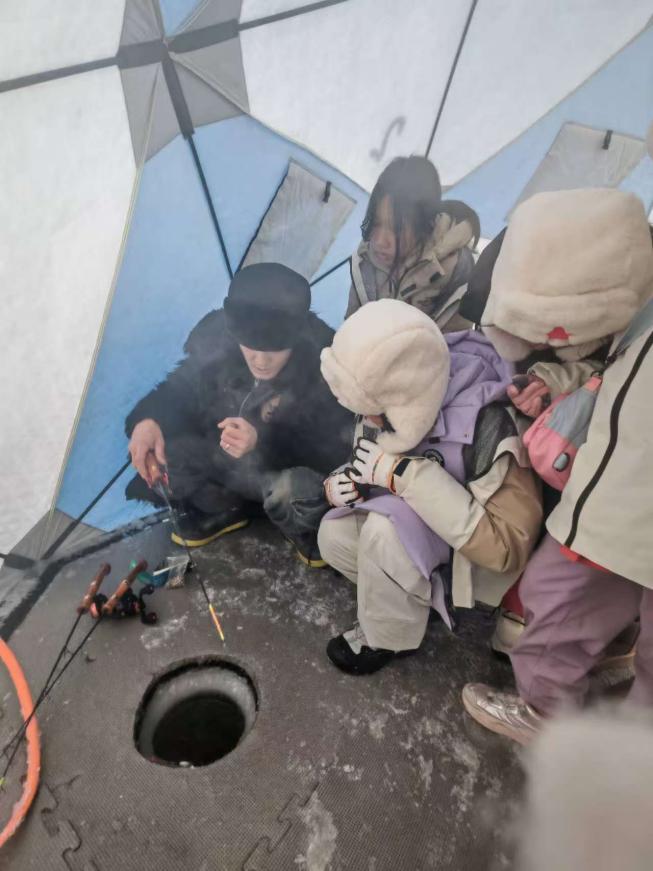 除了文学的探寻,这一天的活动还充满了趣味与欢乐。营员们走进河口湿地,尽情享受冰雪带来的乐趣。打雪仗、出溜滑,欢声笑语回荡在冰天雪地之中。在帐篷里围炉学冰钓,更是别有一番情趣。当看到鱼饵竟然是“杨嘎啦”时,营员们不禁惊叹于东北人民的智慧与独特的生活方式。