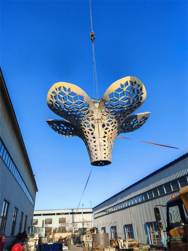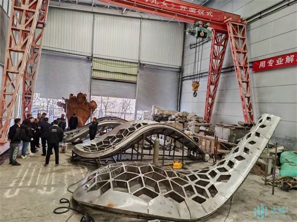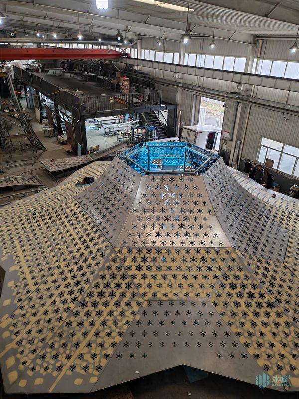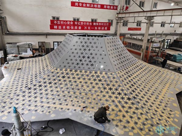 在方案完善的同时,专班即邀请清华美院来哈,对方案从创意、设计深化、材料选择、加工制造、工艺工法、拼装方式、吊装安全、运输保护及系统间工序关系等逐一进行研讨排布,此外,专班还抓住几个关键工期节点,切实倒排工期,紧密衔接工序。最终,统筹协调幕墙、灯光、燃气及相关加工厂家在最短时间内形成一个整体。